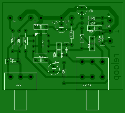 Túl szellős az elrendezés, a 22k poti bekötésén módosítanék, hogy akár log potit is be lehessen építeni. A LED-et feleslegesnek tartom. A bemenetre tennék egy csatoló kondi beültetési lehetőséget. Meg ami menet közben még eszembe jut...