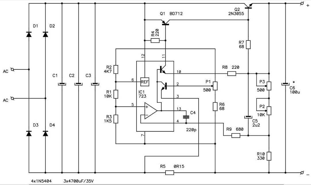 C1 - C2 - C3 .mal párhuzamosan, C6 -tal párhuzamosan és az LM723 12. és 7. lába köté kötnék 100nF kerámia kondenzátort a lehető legrövidebb veztékekkel.