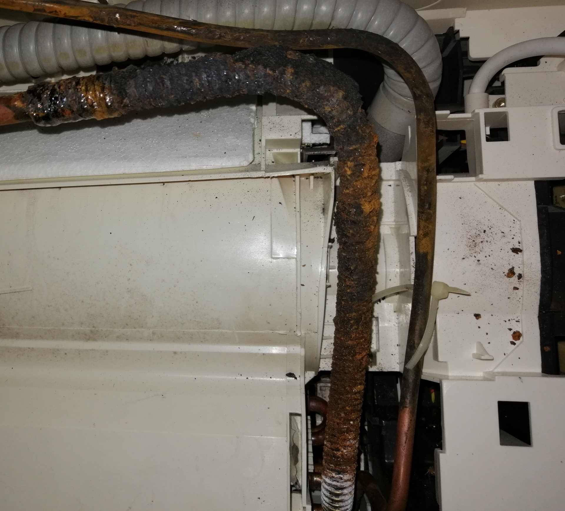Mindkét cső vörösréz, az legfeljebb némileg oxidos (de az nem rozsda), a vastagabbon, de nem a csövön, hanem a rajta lévő acél csőhajlító rugón, valóban rozsda van... A kép bal szélén 3cm-en látszik a rézcső. Külön nem kell vele foglalkozni (ha zárt volt eddig is), majd a vákum és nyomáspróba eldönti, a csövek jó eséllyel nem lehetnek lyukasak. Üdv: StMiklos