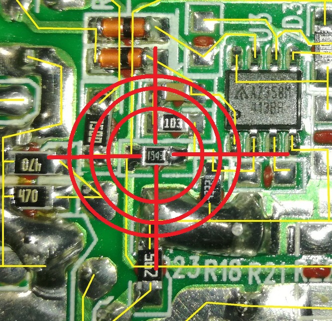A képen jelölt helyre a meglévő ellenállással árhuzamosan kötöttem egy 570K értékűt. Sajnos a feszültség nem stabil; 8,5 és 9,3V között folyamatosan változik.