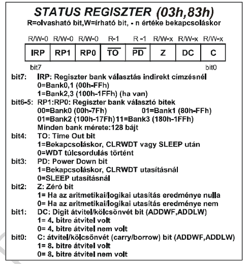 Ennél a kontroller családnál max.512 regiszter címzésére van lehetőség, melyek 9 bites címzést igényelnek ( 9 biten tudsz 512 kombinációt létrehozni!). Az utasítás gépi kódjába viszont csak 7 bitet tettek bele ( valószínűleg rendszerszervezési okokból !), így kell még további két bit a tényleges címzésnél! Regisztert kétféleképpen címezhetsz: közvetlenül (direkt) vagy közvetve (indirekt). Indirekt címzésnél egy regiszter (FSR regiszter) mondja meg, hogy igazából ki a címzett és ilyenkor az FSR 8 bitjét kiegészíti a STATUS reg. 7. bitje, így lehetővé teszi egy időben 256 regiszter címzését ( de a lehetséges 512 regiszter 2 részre van osztva a 7.bit által!). Ha direkt címzést használsz, akkor az utasításba csak a címzett regiszter 7 bitje fér bele és a tényleges címzéshez szükséges 2 további bitet a STATUS 6-5.bitje adja ( ezt nevezik BANK választásnak!) és így 4*128-as csoport érhető el!