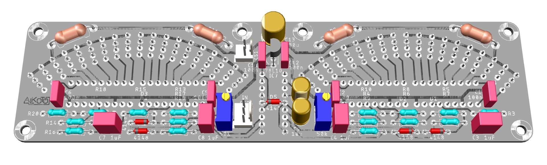 Rajzoltam egy panelt a kapcsoláshoz, ami egy régi kettős mutatós műszer skáláját imitálja. Szokatlan módon, a két csatorna IC-i ellentétes oldalon vannak. Ez a megoldás azért tűnt kézenfekvőnek, mert a tükrözés miatt az egyik csatornán nagyon elbonyolódott volna a panelterv rajzolata, ha egy oldalra kerültek volna az alkatrészek. Ez a 3 IC nincs útban a beépítésnél, ezért csak a szokatlanság az egyedüli hátránya a dolognak. Szívesen olvasnék véleményeket az áramköri megoldásról és a paneltervről is.