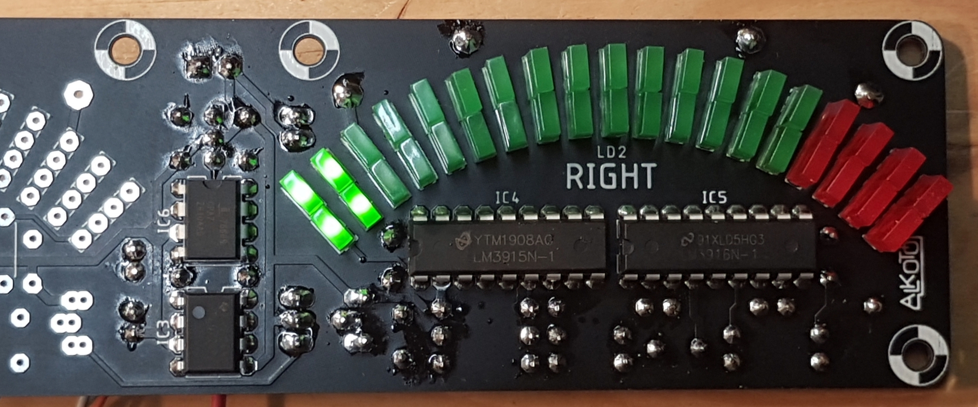 Rajzoltam egy panelt a kapcsoláshoz, ami egy régi kettős mutatós műszer skáláját imitálja. Szokatlan módon, a két csatorna IC-i ellentétes oldalon vannak. Ez a megoldás azért tűnt kézenfekvőnek, mert a tükrözés miatt az egyik csatornán nagyon elbonyolódott volna a panelterv rajzolata, ha egy oldalra kerültek volna az alkatrészek. Ez a 3 IC nincs útban a beépítésnél, ezért csak a szokatlanság az egyedüli hátránya a dolognak.
