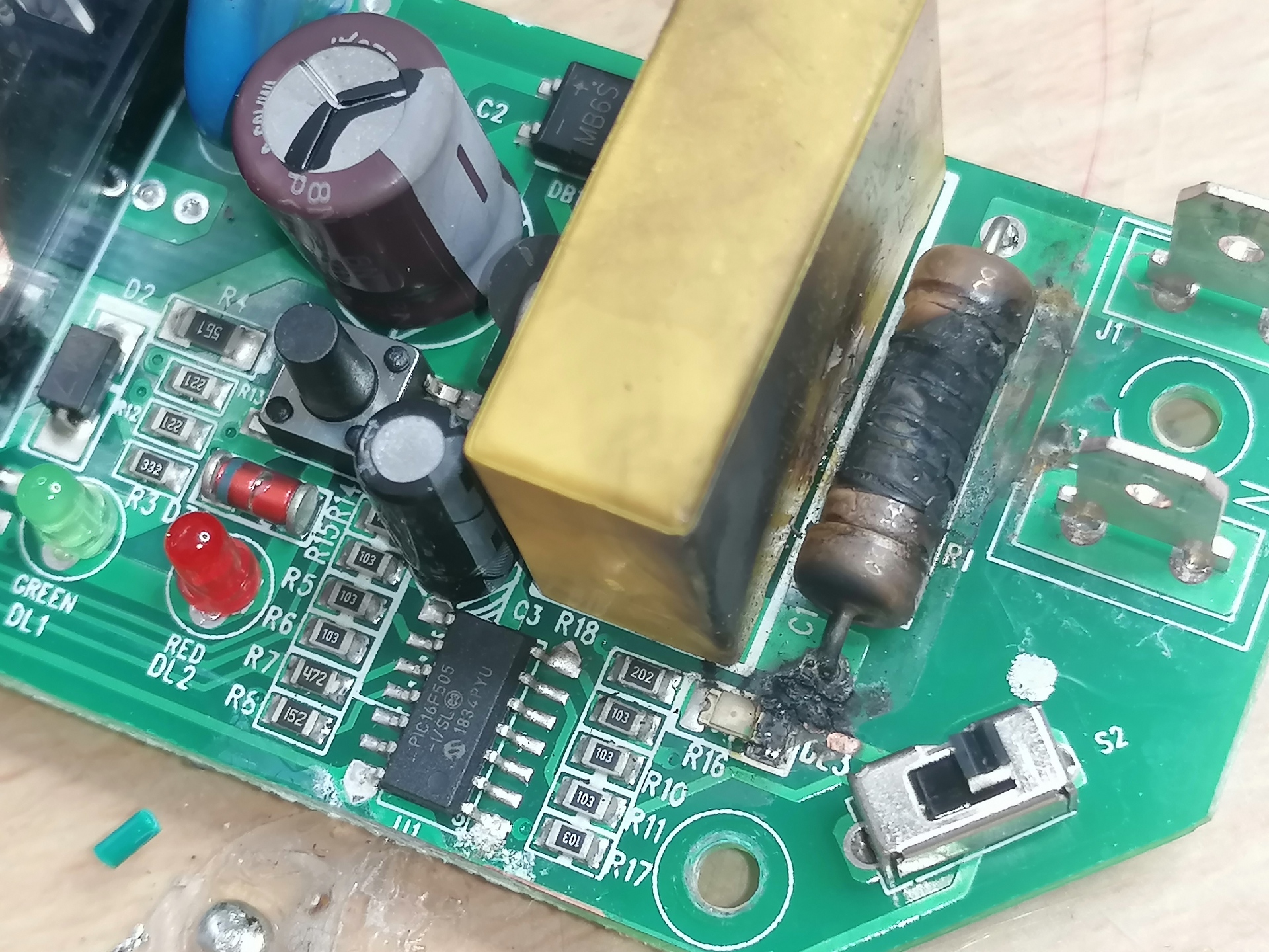 Ez nem kapcsolóüzemű táp, hanem egy soros kondenzátoros, ami miatt gyakorlatilag a panel bármelyik pontján ott lehet a fázis! (Nincs galvanikus leválasztás, így szekunder sem.) Első körben vedd ki az ellenállást, és a mellette lévő sárga kondenzátort. Az MB6S jelzésű graetz hidat kéne megfelelő AC feszültséggel megtáplálni. Ha van relé a panelen, akkor ahhoz méretezett feszültséggel, ha nincs, akkor a kontrollernek (PIC16F505) elég lehet 8-10 V váltófeszültség, mivel ott van mellette egy zener dióda. De ha emiatt a durr miatt tönkrement a PIC, akkor kuka az egész. A hozzászólás módosítva: Jún 17, 2020