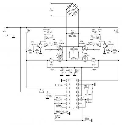 Én régen építettem 1 fázis be 1 fázis ki, kis frekiváltót kisérleti célra. 4 FET a kimenet, meghajtva 2db IR2111-gyel, ami pedig egy PIC-ről kapja a vezérlést. A kimenet 4,88kHz-es PWM modulálva 0..50Hz között állítható szinusszal. Közben a feszültséget is a frekvenciával arányosan csökkenti. Azaz mint egy normális frekiváltó. Most elővettem, és kipróbáltam mit művel egy hasonló 230V-os árnyékolt pólusú ventilátorral. Működik róla, a fordulatszám állítható a teljes tartományban, de minél kisebbre veszem, annál jobban sípol a motor. Működik, de ebben a formában nem használható, mert nagyon hangos a sipolás. Max, ha 20kHz körül menne, mert akkor nem lehetne hallani, csak a kutyák lennének idegesek a közelben. TL494 nem ad neked szinusz modulált kimenetet, azzal nem tudsz frekvenciaváltót csinálni. A max amit elérhetsz az az 50Hz illetve az alatti négyszögjel, de ekkora frekvencián nem tudom működik-e a TL, illetve a kapcsoló tápbol kitermelt trafó helyett egy normál lemezes trafó kellene. A TL egy zsákutca erre a célra.