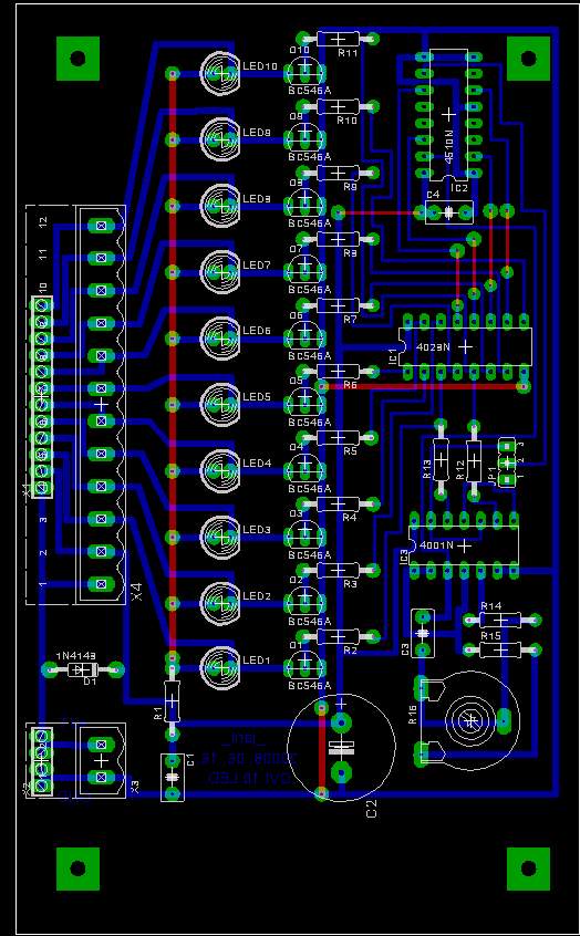 vetnétek egy pillantást a nyákomra, hogy jól van-e megtervezve? első saját tervezés a tetején a ledeket szalagkábelen tervezem kivezetni, így a panelnek teljes a mobilitása és könnyebben beépíthető 5.25ös helyre a tükrözés még nem történt meg (nem tudom, kell-e, nem néztem még meg, hogy merről áll az ic )itt a nyáktervem: nyákterv itt pedig a kapcsolás: kapcsolás annyi módosítást már tettem, hogy a szélén futó +12V-os ágat nem olyan hosszan vezetem el, hanem rövidebb úton
