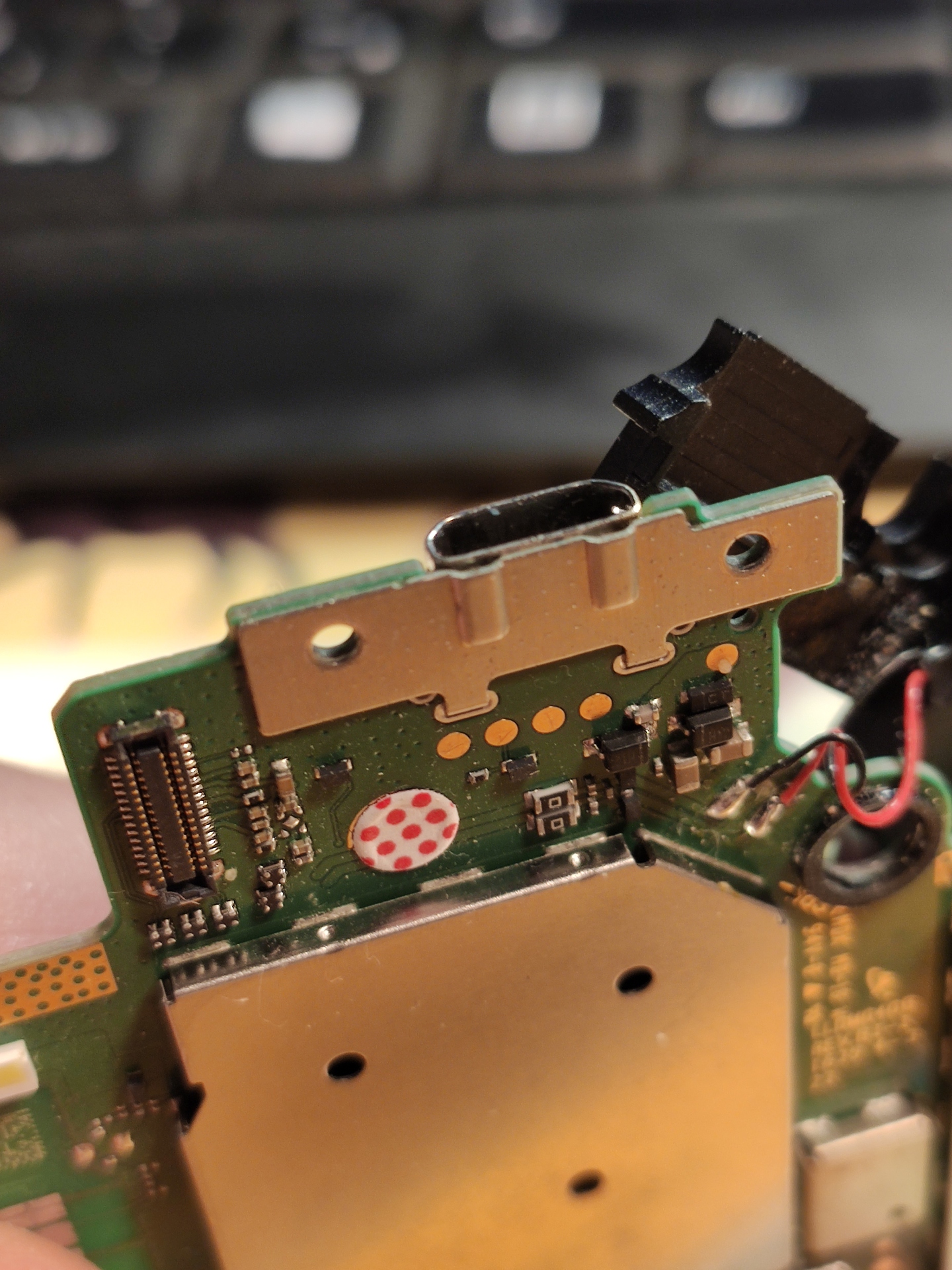 Van egy Lenovo P8 TAB3 8 plus tabletünk, és sajnos a gyerekek tönkretették a töltő micro USB aljzatot. A csatolt képeken lehet látni, hogy belül elhajlottak a kis érintkezők. Megpróbálnám kicserélni az usb aljzatot, de én ilyet nem láttam még. Mi az a piros trutyi a forrasztásokon? Megkaparva kemény. A panel másik oldalán az a lemez az aljzat része lehet, vagy csak hozzá lehet forrasztva? Milyen forrást tudtok, ahol micro usb aljzatot lehet venni?