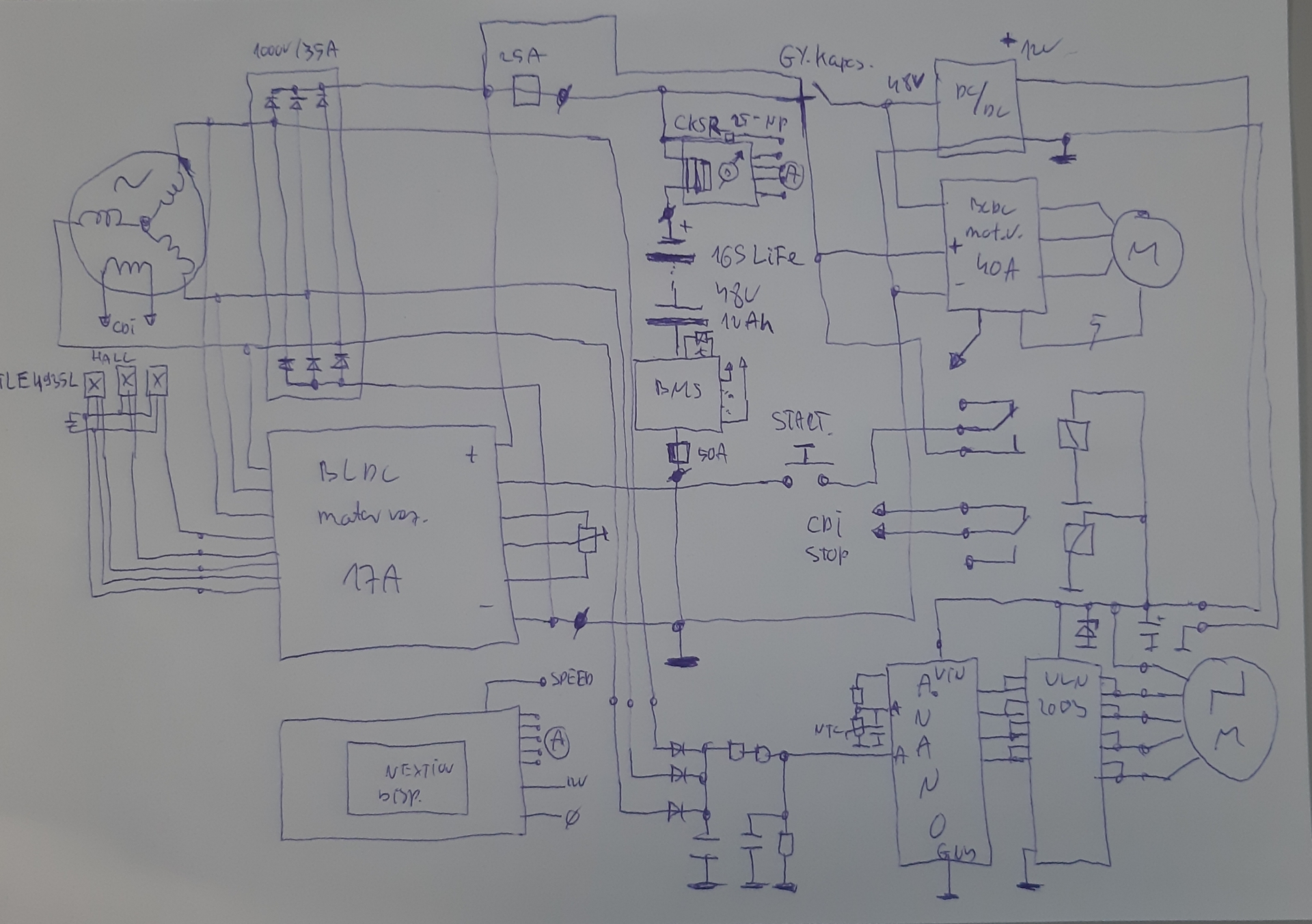 Kicsit át let alakítva, át van tekercselve a meg a generátor látja el az önindító szerepét, illetve a fesz szabályzó saját tervezés arduinóval,a generátor 1000W -ot a d le de a teljes sebességhez ami 45km/h 1200W kellene.