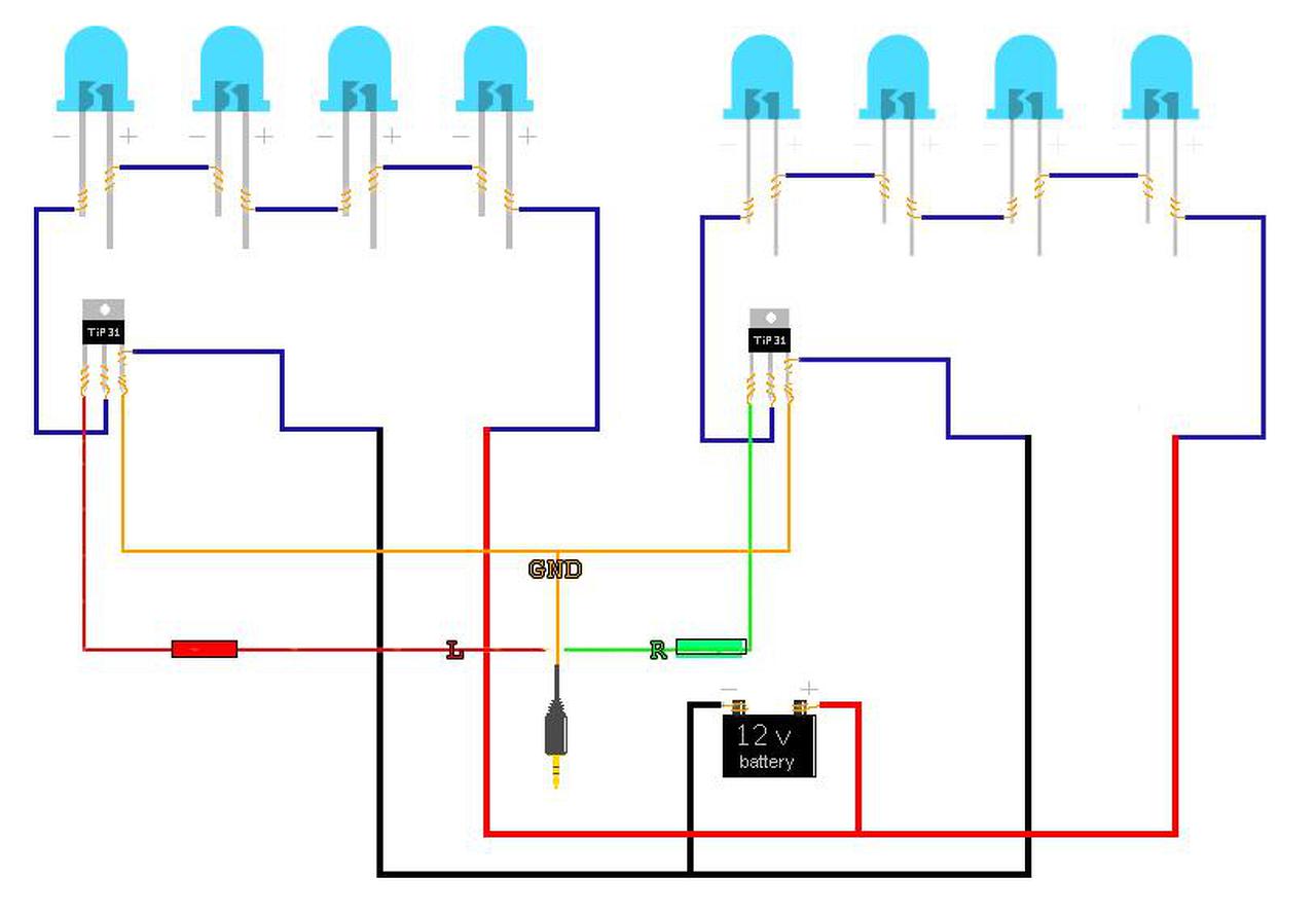 Láttam sok helyen ilyen BD243C-tranzisztorral működő zenére villogó ledeket. A kapcsolást csatolom.