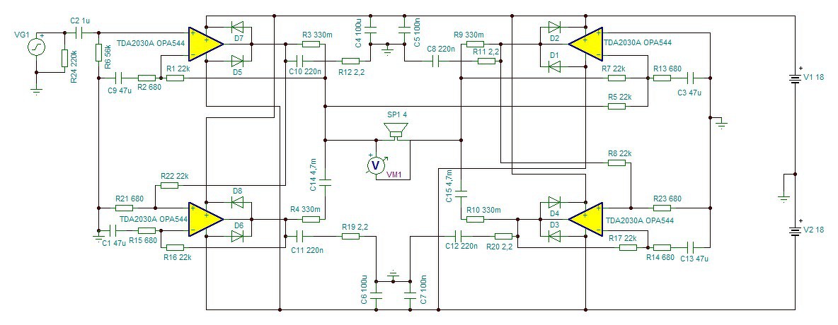 ![]() Az áramkör clip indikátort is tartalmaz. Kicsit át kell dolgozni, mert az rajon szereplő alkatrészértékek ±25-30 V-os táphoz illeszkednek. Tovább kutatok a kapcsolási rajza után.