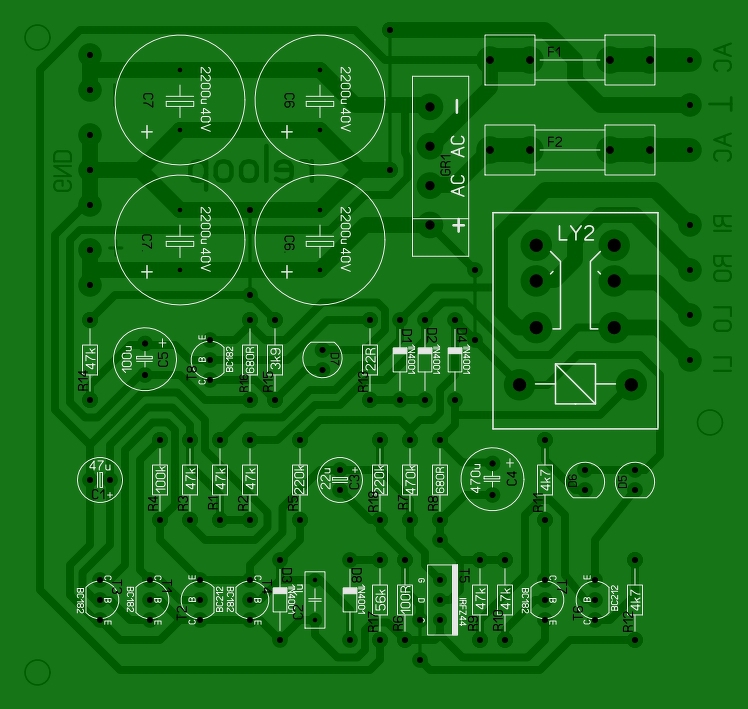 A tervet azért exportáltam jpg-be, mert ebben a formában nem illeszkedik a TDA2030 tápfeszültségéhez, dolgozom a módosításon. Segítséget jelentene, ha kapnék ajánlást mindenki által könnyen beszerezhető 12 V-os kétmorzés relére. Az LY-2 annak idején a fiók mélyéről került elő. Az R8-C4-et úgy kell méreteznem, hogy C4 töltődése után a tekercsfeszültség csak a tartáshoz legyen elegendő, így kevesebb a fogyasztás és gyorsabb az elengedés. Változik majd a kondenzátorok feszültségtűrése, így nem csak kisebb, de olcsóbb is lesz a panel. A clip-et és a LED-ek áramát 15 V-hoz kell igazítanom.