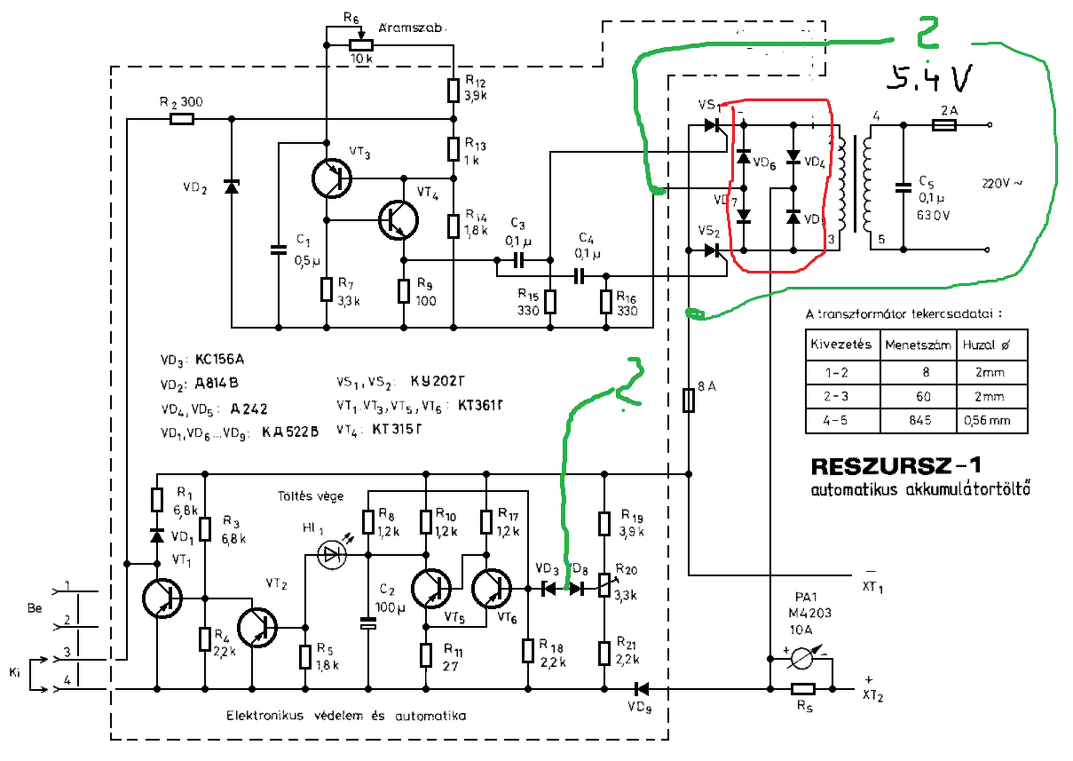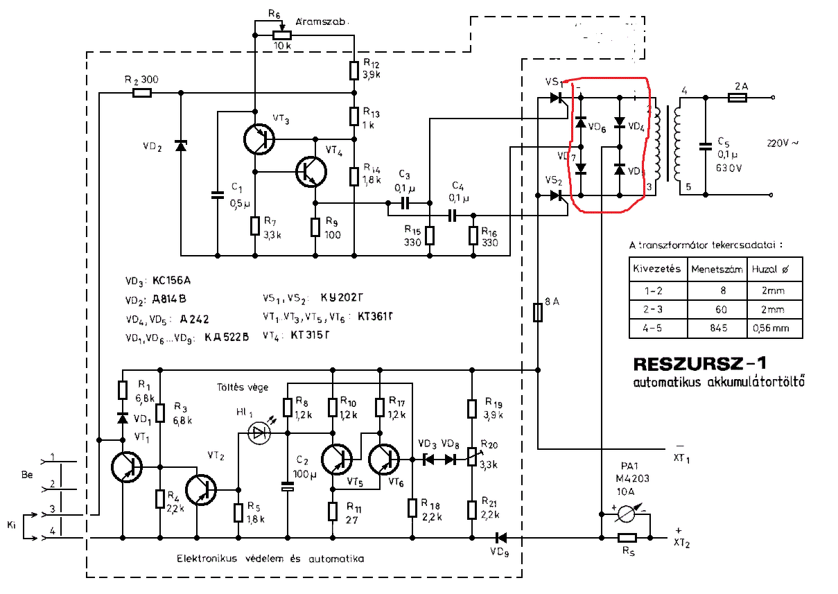 - Az akkumulátor töltése egy "vezérelt egyenirányító". Ez egy Graetz, csak éppen a pozitív felét a VD4-VD5, a negatív felét a két tirisztor alkotja. A Vd6-VD7 csak az áramszabályzó fokozat tápját állítja elő.