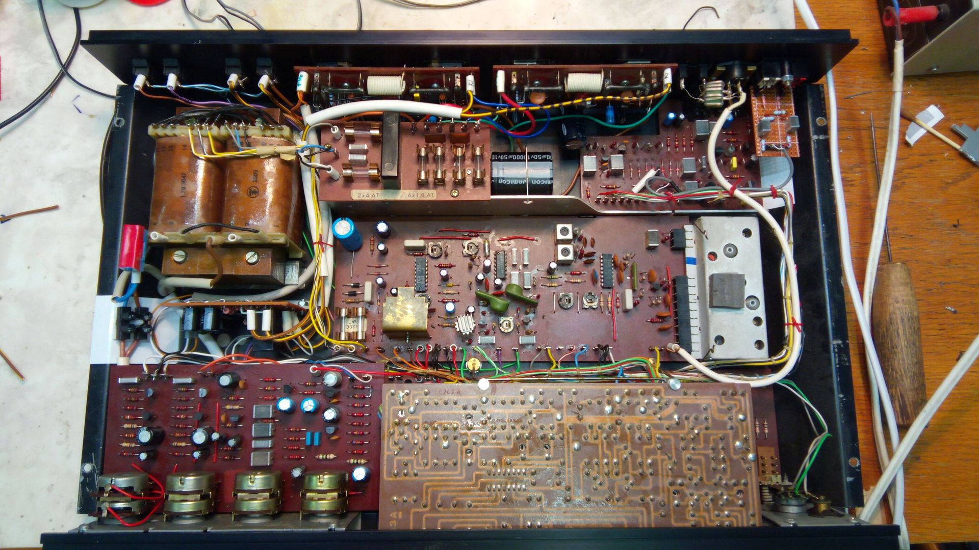 ), TR4 áteresztő tranzisztort két független diódának mérte a teszter, 14,5 V helyett 19,4 V feszültség figyelt az emitterén. Cseréltem egy 'combosabb' fémtokos 2N-re. Még a hangszín utáni szűrőpanel C1/2 kondenzátorát kicserélem, mert eddig szinte minden hozzám került Dansk-ban ezek is pF értékűek voltak 2,2 µF helyett.