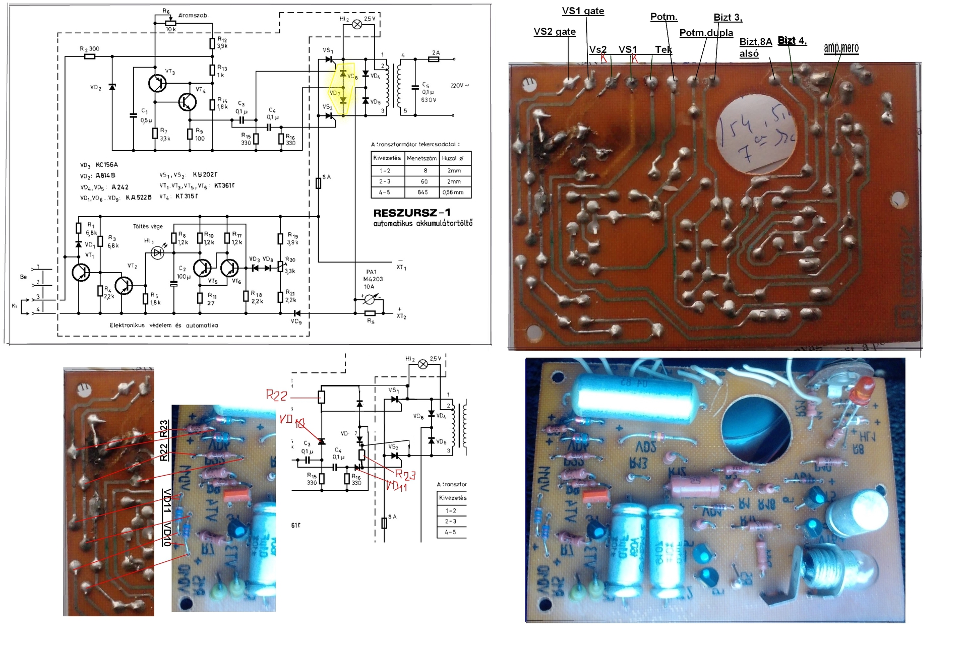 Sziasztok! Kaptam én is egy hibás Reszursz-1 töltőt alkatrésznek, épp olyat ami amúgy nekem is van. Ki akarták dobni, de én elhoztam, gondoltam jó lesz valamire, meg amúgy is egy igen jó kis töltő ez szerintem. Természetesen a kíváncsiság hajtott, így szétszedtem, mert semmi életjelet nem adott. Kicseréltem a 2A-es biztit, és van fény. Azaz a 2,5V-os üzemet visszajelző égő világít. Enyhén zúg a trafó, de semmi egyéb. Habár ilyen töltőm van nekem is, soha szét nem szedtem, így a belsejét most látom először. Látok benne egy bazi nagy elszigetelt hűtőbordát, ezen két KU.. tirisztort, illetve mellette a szerkezet fém vázáról felhajlított lemezen 2db diódát. Miután megnézegettem a kapcsolási rajzot elsőre 4db diódára számoltam volna, de ahogy látom csak kettő van benne. Miután kicseréltem a 2A-es biztit természetesen próbálgattam is, rácsíptettem egy gépkocsiizzót hogy lássam van-e a kimeneten bármi is. Hát ööö.. első körön nincsen. Tehát nem úsztam meg egy biztosíték cserével sajna. Aztán próbálgatás közben vettem észre hogy a bekapcsolás pillanatában mintha próbálkozna, "gyújt", azaz felvillan az égő, hol csak pillanatra, hol intenzívebben, és ilyenkor az árammérő is picit moccan. De nem indul meg, hanem pillanatok alatt "leáll". (8A-es biztosíték ép). Arra gondoltam hogyha működőképessé tudnám tenni, akkor kiemelném az alkatrész státuszából, és lenne 2db töltőm. Merre induljak, mi lehet a problémája?