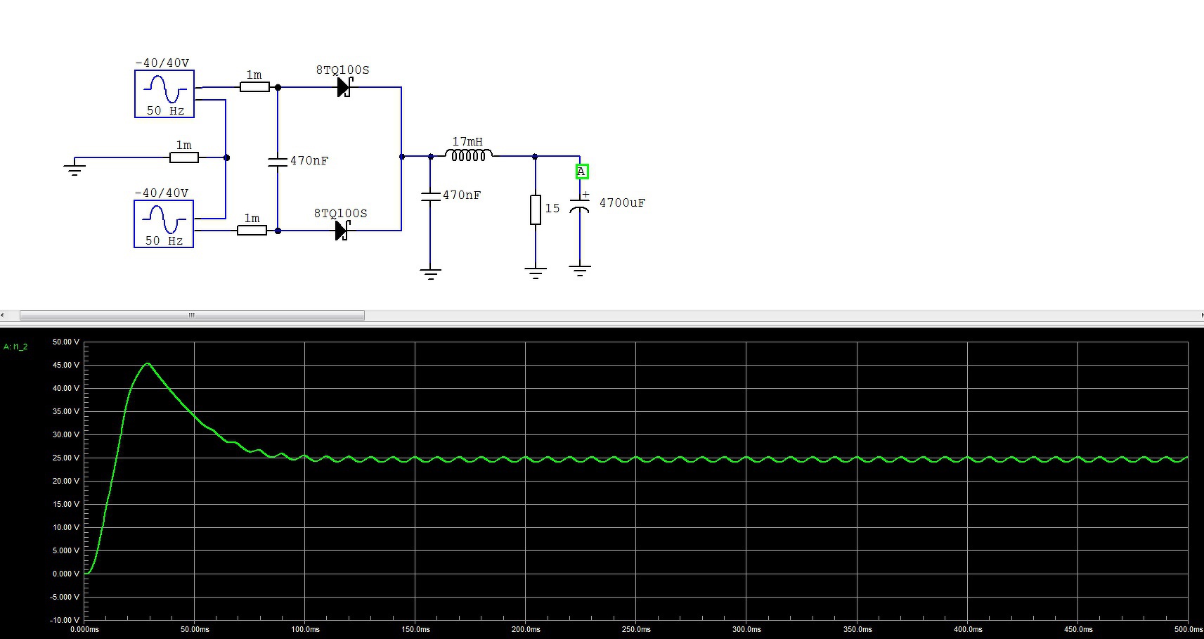 Két hangolási szakaszt látok. Az elsőnél az induktivitás értéke nullától az optimumig tart. Kis induktivitásnál végül is nem sok minden történik egy hagyományos sima pufferelt táphoz képest. Ahogy növekszik a fojtó induktivitása, a kondenzátort töltő áram csúcsa elkezd szétlapulni. Egy kritikus induktivitásnál a fojtó előtti feszültség a nullaátmenetekben nullára csökken, a hálózat felől nézve pedig leginkább ilyenkor hasonlít legjobban egy Ohmikus terhelésre a tápegység. Tovább növelve az induktivitást a kimenő egyenfesz hullámossága csökken, így kisebb szűrőkondenzátor is alkalmazható, de a hálózat felől a a teljesítmény tényező megfordul, és amolyan áramgenerátoros terhelést lát a hálózat.