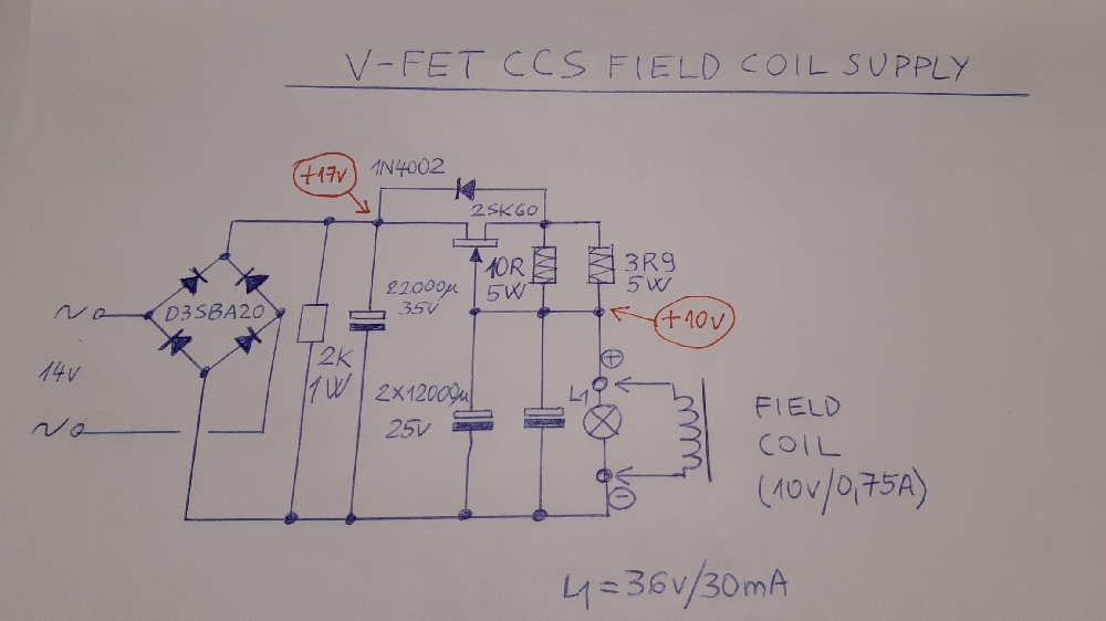 ![]() Azért néhány dolog kiderült közben, és ezért változtatni is kellett az eredeti ötlethez képest. 1. Az a korábbi 1,5 amperes érték a kettő DIY field coil hangszóró gerjesztőárama volt, tehát egynek csak 0,75 amper kell 2. Így a kisebb áramígényhez méreteztem a most beépített alkatrészeket 3. Mindenképpen szükséges a V-FET védelme a különböző szélsőséges helyzetekben - kimarad a hálózat, véletlenül kihúzzák a DIY field coil hangszórót tápláló vezetéket 4. Így bekerült a kapcsolásba egy védődióda, valamint egy, a pufferkondit kisűtő ellenàllás 5. A jelzőlámpa egy 36v/30mA-es izzó, mert ugyan 10v van üzem közben a kimeneten, de ha kihúzzák a gerjesztőtekercs csatlakozóját, akkor 20v fölé megy a kimeneti feszültség (ez a CCS áramkör tulajdonsága). TJ |