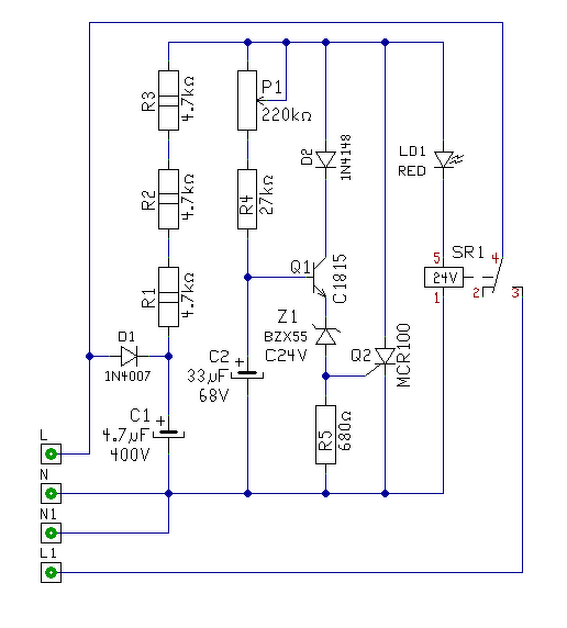 Mérjél feszt az N és a D1, D2 anódon, amikor ráadod a feszültséget az L pontra (időzítés lejárta előtt a műszer előre legyen rátéve). Utána újra szakítsd mega bejövő feszt és az N, valamint a C2-re mérjél rá. Itt az időzítési ciklús végére fel kell töltődnie a kondinak 24V-ra. Várom az adatokat. Üdv. M.