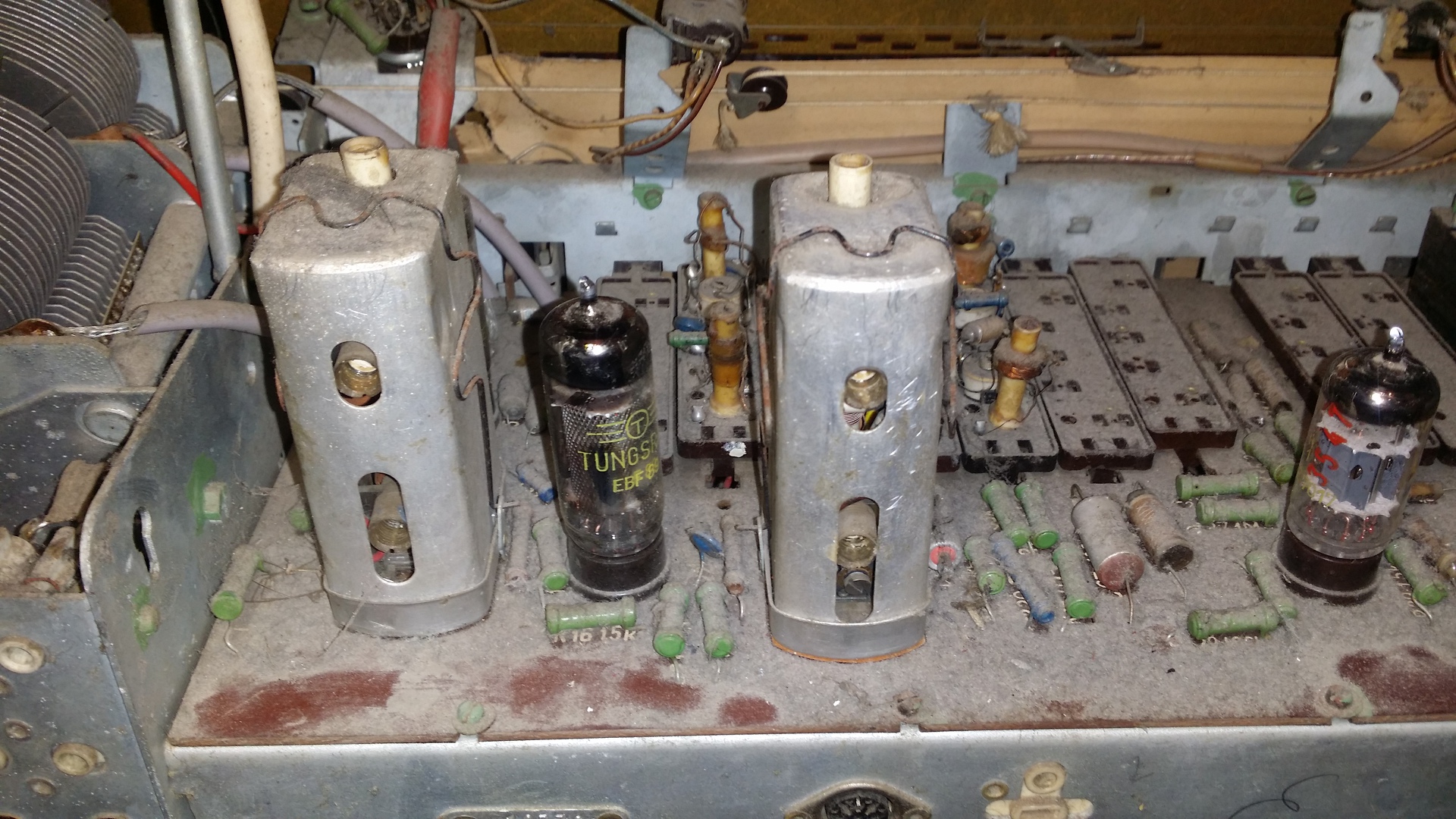 A tuner rész viszont nem nagyon akar adót fogni, bár némi sustorgás pattogás sercenés helyenként hallható. kizárható hibák: csőlábakat megtisztítottam, bár nagyon szépek voltak, nincsenek elfeketedve ferriten a huzalok szakadásra ellenőrizve átkapcsolt ferrit / external antenna sem mutat sok különbséget; minden cső fűtése rendben ebf89, ech81 csöveket tesztre cseréltem, változás nincs; Az em80 cső vékony zöld csíkot mutat végig a hangolás során, nem szélesedik ki a sáv sehol. mit nézzek meg, hol veszhet el a jel?