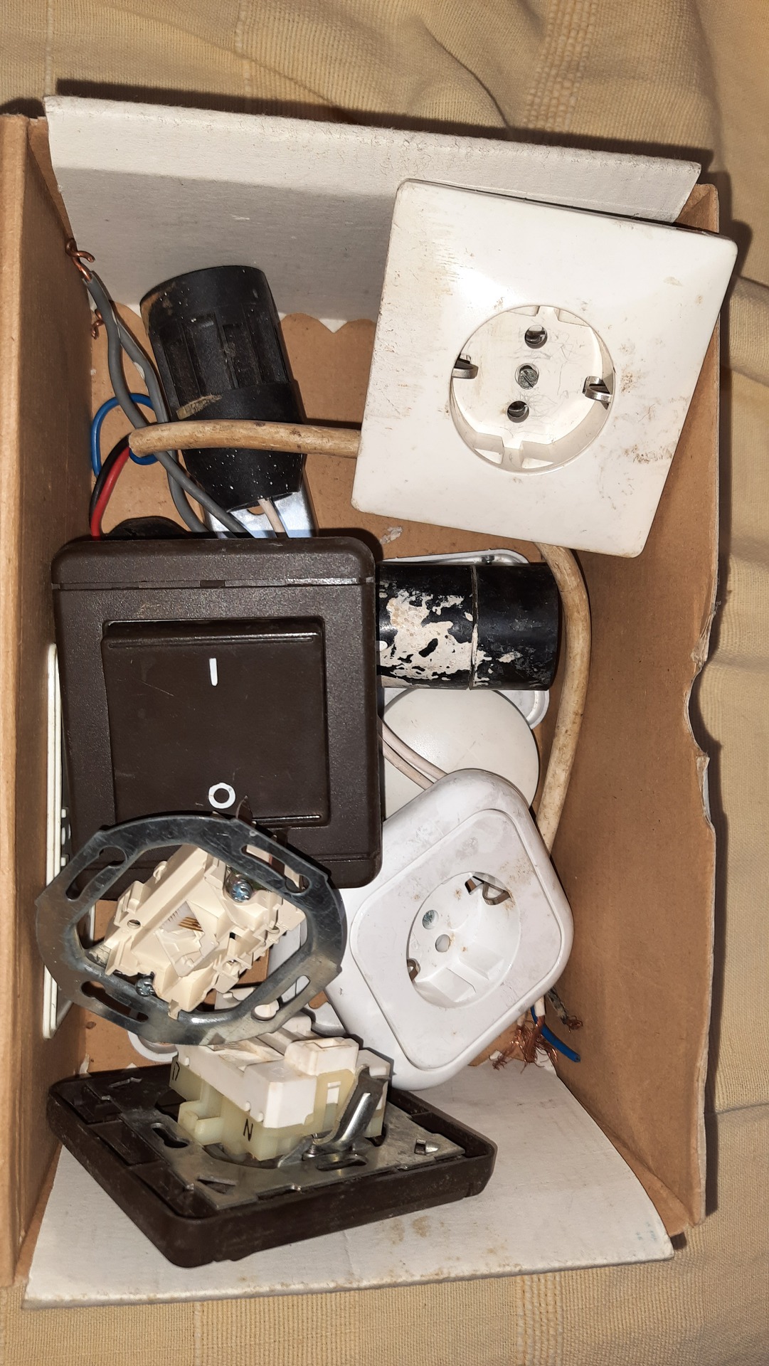 Szintén ugyanígy egy doboz villanykapcsoló, konnektor, telefonos fali aljzat, orosz csillár (E27 égő fogalat), konnektorhoz keret, egyebek...
