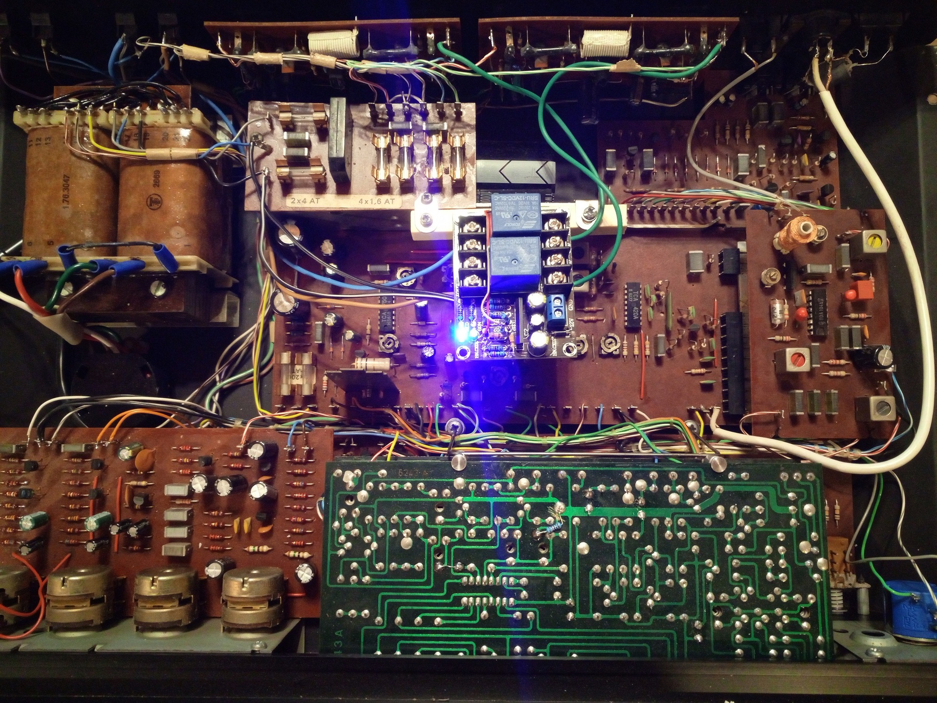 :Megkapta az ajánlott módosításokat: - primer oldali biztosíték - AFC kondi pótlás - TR4 csere - összes elkó cseréje - végfokok teljes módosítása plusz: - FM tuner tranzisztoros erősítése - állomáskereső potméter helipotira (sokfordulatos) cserélése - relés hangszóróvédelem amit még nem mertem kipróbálni: - a 3F Dansk matrica leszedése, hátha alatta lenne a Tungsram logó ![]() Nélkületek ez nem jöhetett volna létre, köszönöm!