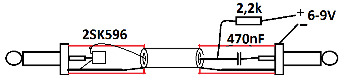 Ha ilyesmit építenél, akkor az erősítő oldali jacknak a házából két vezetéken lehet adni tápot.