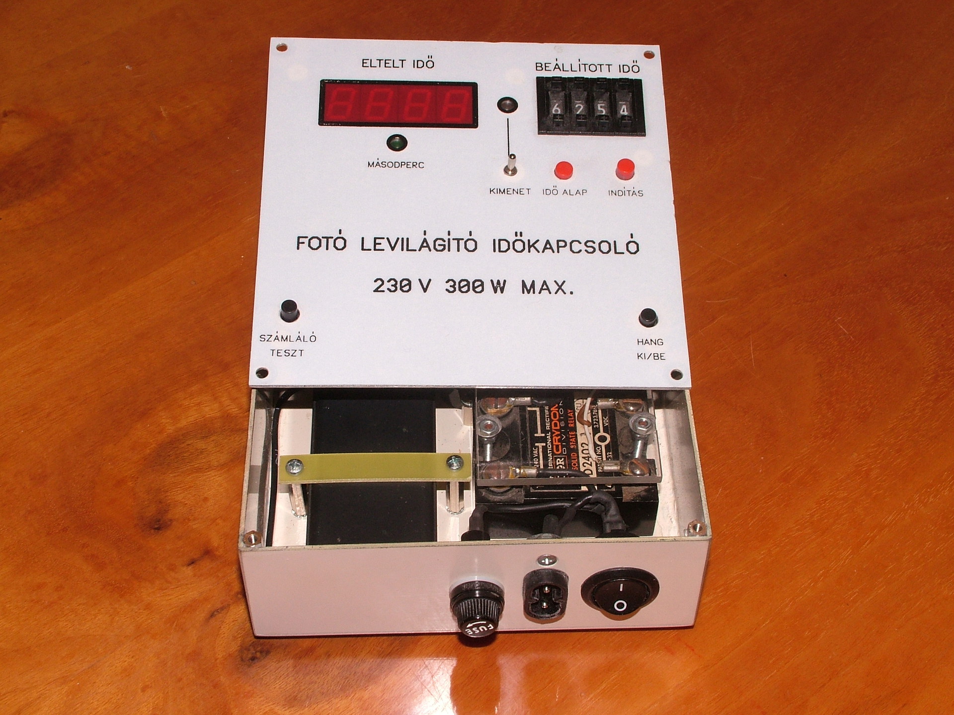 Ez is kész volt, és már régóta várt a szitázott fólia előlapra. Megkapta. A peremkerekes kapcsolóval beállított ideig (ami lehet perc vagy másodperc), bekapcsolja a kimenetre rákapcsolt világító testet (szilárdtest relével). Max. idő = 9999 perc Max. teljesítmény 300W Lejárt időnél hangjelzés. (be/ki gomb) Számláló / kijelző tesztelés gomb. Egy nem túl jó bemutató róla