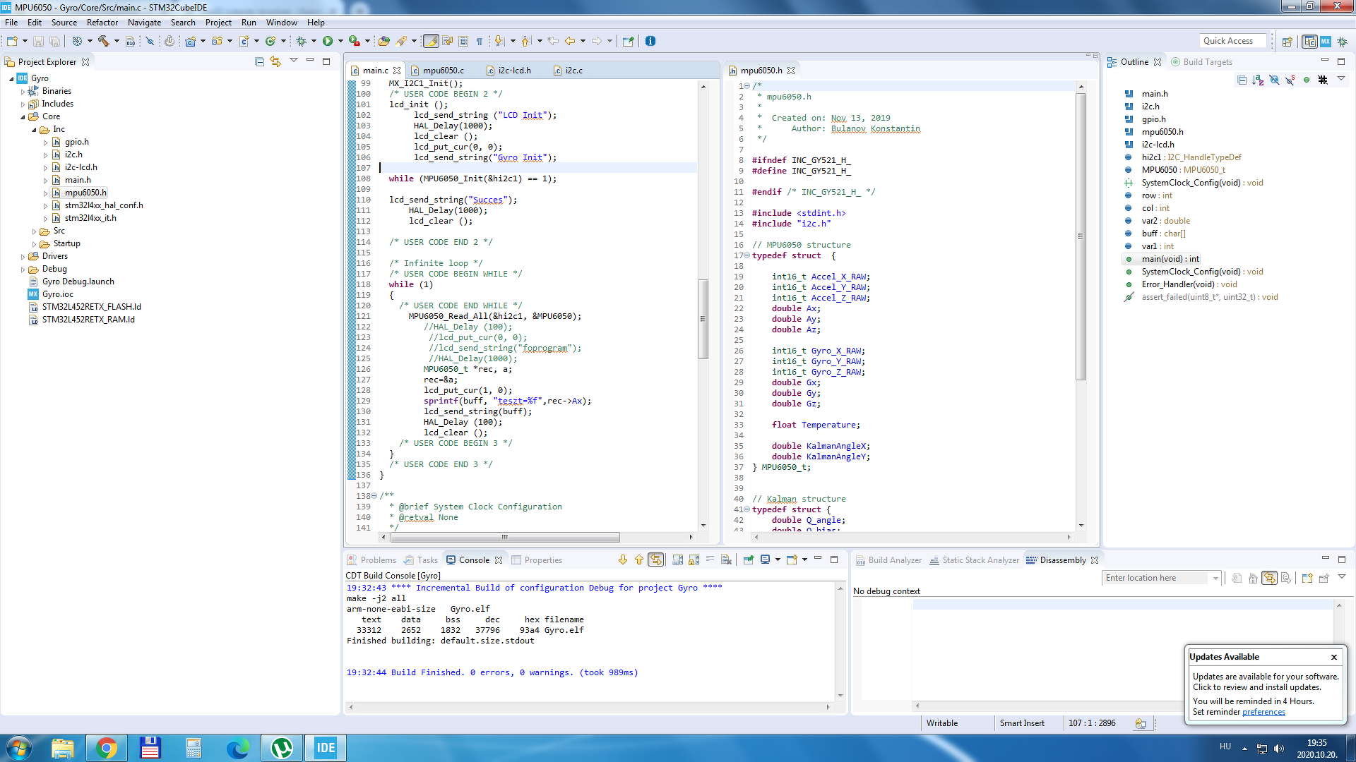 Egy MPU6050-es giroszkóp regisztereit szeretném olvasni a Githubról letöltött minta programmal. A board egy STM32L452RET6. Kiegészítettem az LCD kiírással ami jól is működik, viszont a struktúra olvasást nem biztos, hogy jól csinálom. Mellékelek egy képet amin látszik a programom és a struktúra elemei. Az I2C kommunikáció gondolom jól működik, mert az MPU6050 init-et befejezi és az LCD kiírás elindul. Mit rontok el? Üdv.