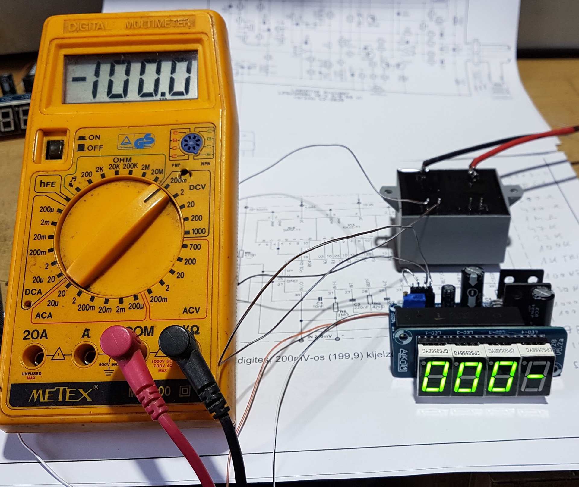 Elsőre indult a mérőegység. A referenciát pontosan be lehet állítani. A panel tisztítása után, rövidrezárt bemenettel stabilan 000 kijelzés van, az előjel néha felvillan. Ez azért is lényeges most, mert nem az itthon kapható IC-ket használtam, hanem amit az Ebay-on rendeltem. Itt sokszor felmerül az eredeti/hamis dilemma, de én a kifogástalanul működéstől többet nem várok el.