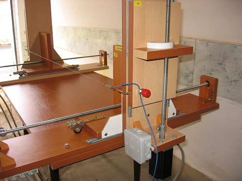 Kizárt, mert nem ez a cél. Olyan elrendezést kértek, mint amilyen az asztali dekopírfűrésznek van. Fix függőleges huzal, nagy asztallal. 0,6-os huzal nem jött be, 0,5-ös még kevésbé.