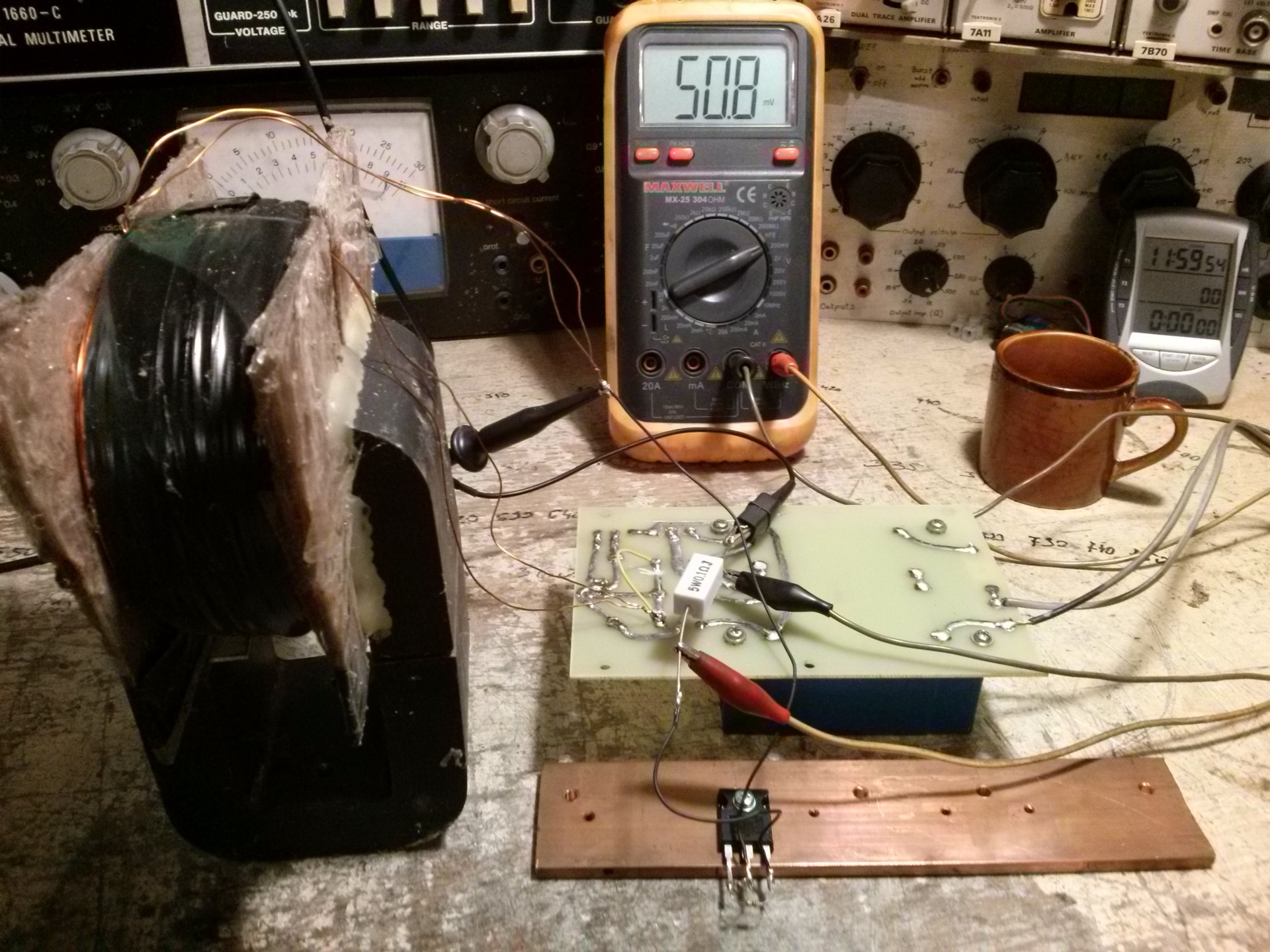 Ne tessék megmosolyogni, ez a legeslegelső "deszkamodell" és mindössze annyit bizonyít, hogy az elmélet eddig még működik a gyakorlatban. A terhelés 22R és pufferkondi egyáltalán nem kell hozzá. Az egyenirányító diódák a teljes félperiódus alatt vezetnek és a "brumm" feszültség itt nem fűrész, hanem a sokkal barátságosabb szinusz.