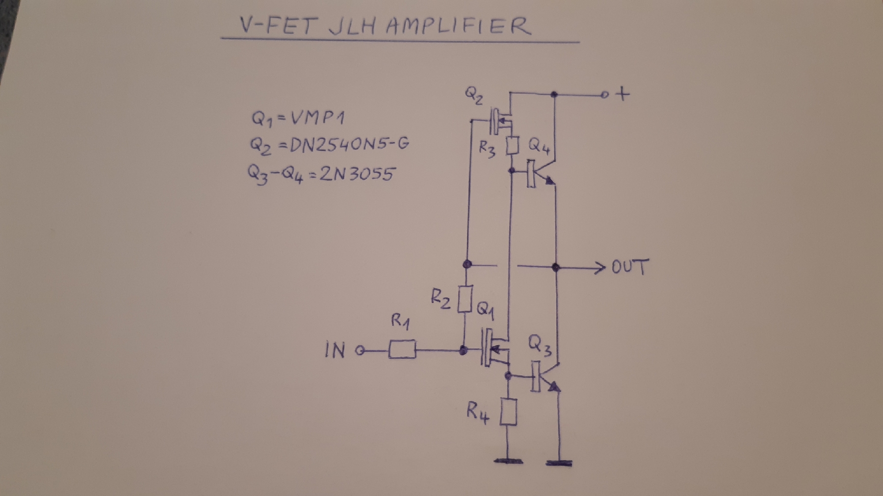 Maga a kapcsolás megalkotója a következőt nyilatkozta róla (may 2000 Electronics World): " my 10W Class-A circuit did not use a push-pull pair of output devices to provide the required low output impedance. Instead it used a 'Darlington pair' connected amplifier stage, comprising Q1 and Q3, driving Q2 as an active load." https://sound-au.com/tcaas/jlhoutput.pdf Mivel sokan azonnal és véglegesen a PP erősítő kategóriába sorolnák a JLH 1969 kapcsolást, azért én szeretnék két megállapítást tenni. 1. A Push Pull erősítők működése "elvileg" tökéletesen szimmetrikus, és amennyivel csökken az egyik aktív eszköz működés közbeni árama - a másiké pontosan ugyanannyival nő. 2. Viszont vannak olyan kapcsolási megoldások, amelyek láthatóan Push-Pull üzemelést produkálnak, de nem teljesitik az első pontba berakott kritériumokat. Ezek lennének az "active load amplifier-ek", magyarul a vezérelt munkaellenállással működő kapcsolások. Elsőre feltűnő jellegzetességük a teljesen aszimmetrikus felépítés, ami igencsak eltér a szimmetrikus elvet követelő Pus-Pull kapcsolásokétól. Ráadásul az SRPP és a White follower esetében, a két sorba kötött aktív eszközön a szokásos A osztályú üzemben ugyanaz a munkaponti áram folyik. Szó nincs az egyik aktív eszköz csőkkenő és a másik ugyanannyival növekvő áramról. A JLH 1969 erősítő tehát véleményem szerint a tervezőjének a megállapítását tükrözi vissza - egy darlington fokozat aktív munkaellenállással kiegészitve. Mindhárom felemlitett esetben az ellenütemű műkődés nem jelentheti az azonnali besorolást a PP erősítők világába inkább a Single End és a PP közti területről van tehát szó. TJ.