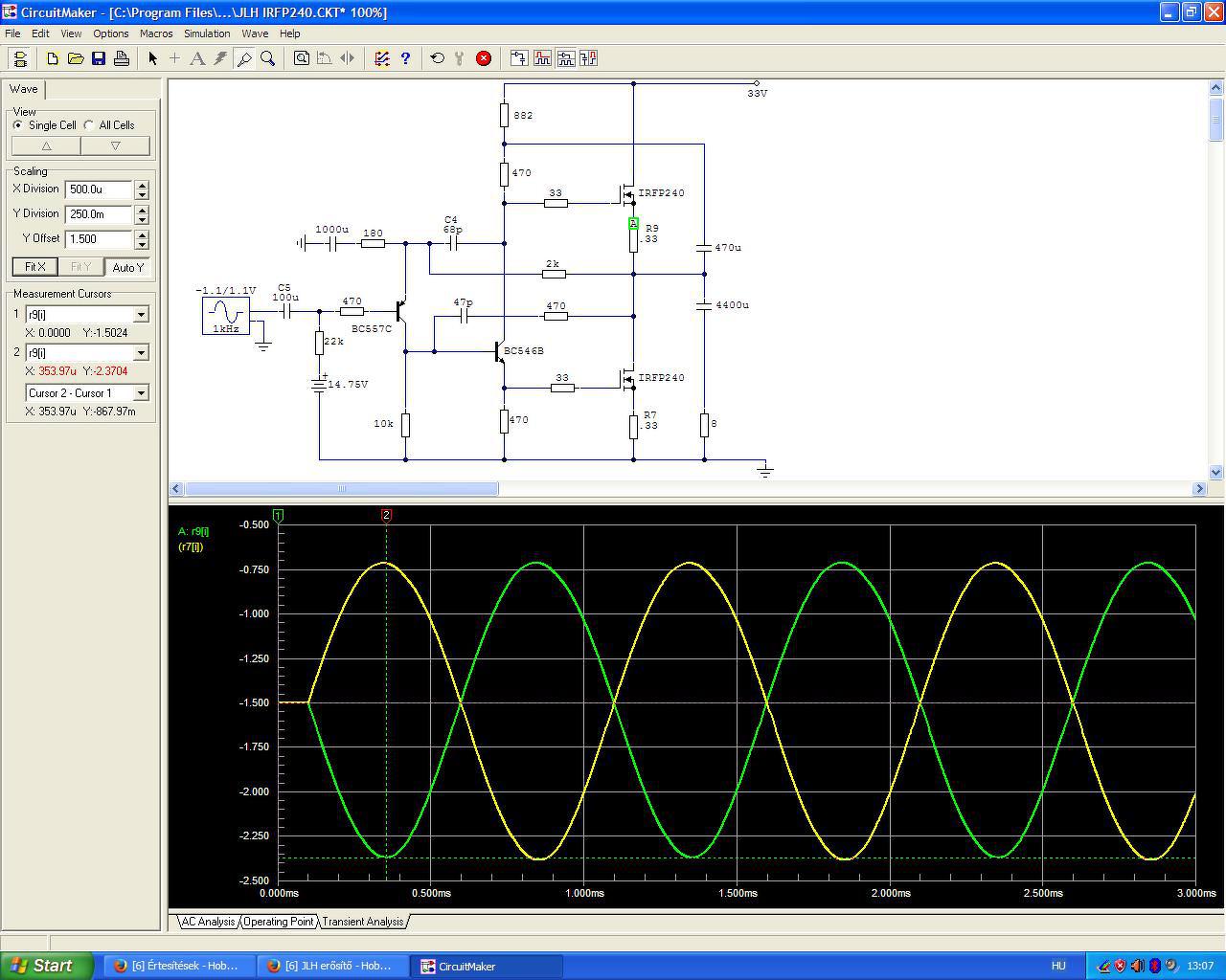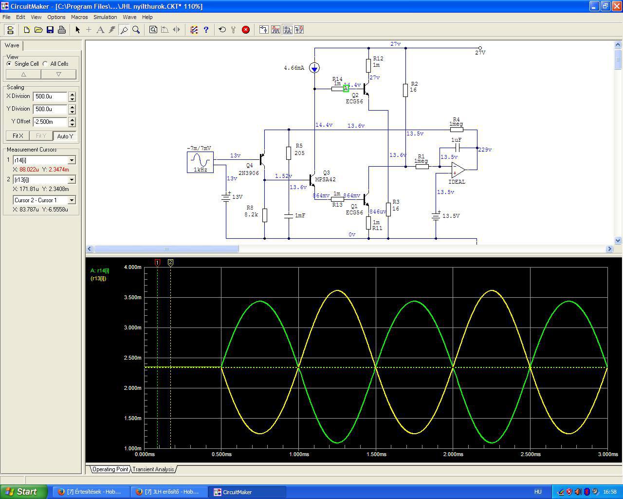 Idézet: „Azért az nagy vidámság, amikor a magyar diyerek megdöntik John Linsley Hood a saját erősítőjének a működéséről mondott állítását” 1. A személyeskedést úgy érzem nem én kezdtem... de szerintem felejtsük el. 2. Valóban nem szimmetrikus a végtranzisztorok árama, sőt nagyobb kivezérlésnél még durvább ez a páros harmonikus jellegű áramtorzítás. Ettől még ellenütemben működnek a végtranzisztorok, tehát "push-pull"-ban. Véleményem szerint akkor lenne SE ha valamelyik végtranzisztor árama állandó maradna. Ezt az áramtorzítást valószínűleg a nagyjelű erősítő és végtranzisztorok egymásra hatásában kell keresni. Az okára nem tudtam rájönni, csak tippelgetni tudok, de azt meg minek. Semmit nem változik a kép sem nyílthurkúan, sem a vcs. tényező függvényében Mindenféle variációban kipróbáltam szimulátorban a JLH-t. A legkisebb torzítású és legjobb tranziens viselkedésű változatnak azt találtam amikor a bemeneti- és a VAS fokozat BJT-k, a teljesítmény tranzisztorok pedig MOSFET-ek. Ennél érdekes módon "megfordul" ez a torzítás és a nagyobb áramok irányban vezérlődik ki jobban. (A nyugalmi áramhoz képest +867mA/-789mA.)