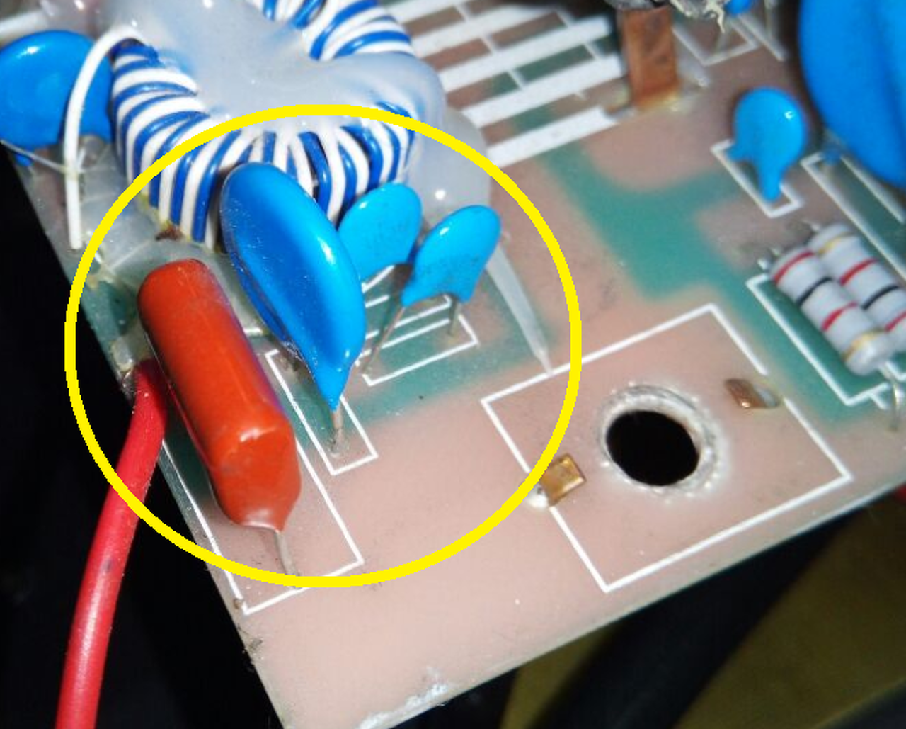 Igen, a nagy kék az egy varisztor. A varisztor párhuzamosan van kötve egy 400V/100nF kondival, ez megy a földelt kasznira, illetve 2db kis értékű kondin át a gyújtás bemenetére, ez a kettő eltávolítva.
