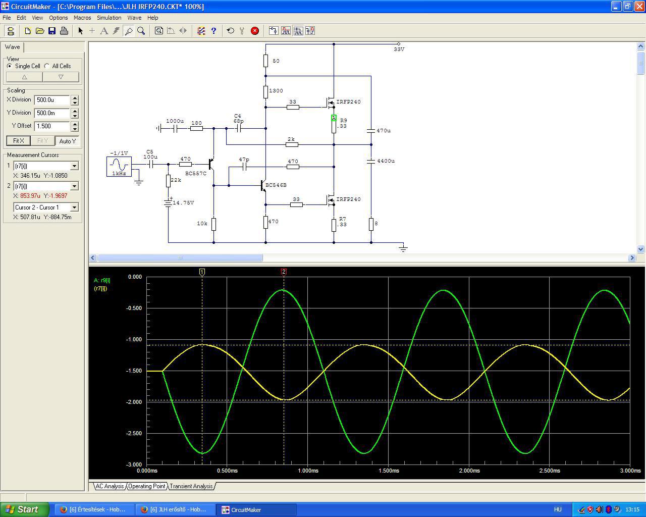 Idézet: „Azért az nagy vidámság, amikor a magyar diyerek megdöntik John Linsley Hood a saját erősítőjének a működéséről mondott állítását” 1. A személyeskedést úgy érzem nem én kezdtem... de szerintem felejtsük el. 2. Valóban nem szimmetrikus a végtranzisztorok árama, sőt nagyobb kivezérlésnél még durvább ez a páros harmonikus jellegű áramtorzítás. Ettől még ellenütemben működnek a végtranzisztorok, tehát "push-pull"-ban. Véleményem szerint akkor lenne SE ha valamelyik végtranzisztor árama állandó maradna. Ezt az áramtorzítást valószínűleg a nagyjelű erősítő és végtranzisztorok egymásra hatásában kell keresni. Az okára nem tudtam rájönni, csak tippelgetni tudok, de azt meg minek. Semmit nem változik a kép sem nyílthurkúan, sem a vcs. tényező függvényében Mindenféle variációban kipróbáltam szimulátorban a JLH-t. A legkisebb torzítású és legjobb tranziens viselkedésű változatnak azt találtam amikor a bemeneti- és a VAS fokozat BJT-k, a teljesítmény tranzisztorok pedig MOSFET-ek. Ennél érdekes módon "megfordul" ez a torzítás és a nagyobb áramok irányban vezérlődik ki jobban. (A nyugalmi áramhoz képest +867mA/-789mA.)