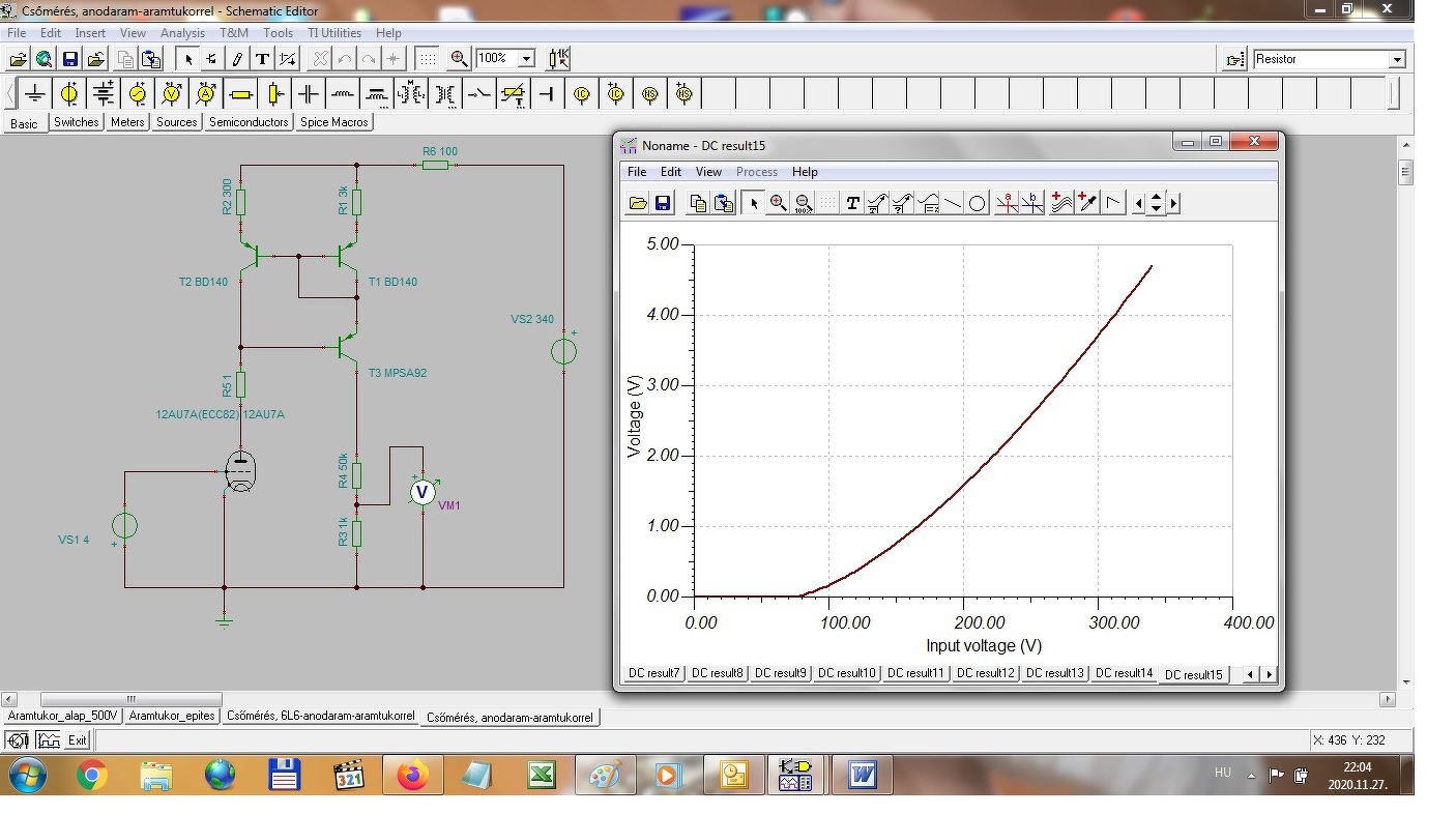 akkor ezt elsőkörben elvetettem mivel az amúgy is nagy anódáram mellé még plusz áramfogyasztót berakni nem tartottan jó ötletnek. Mivel a többi megoldással sem jutottam egyértelmű eredményre, elővettem az áramtükör ötletét újra. A szimulátor mérések elsőkörben egészen jó eredményeket adtak, az alábbiakban egy kép a szimuláció eredményéről.