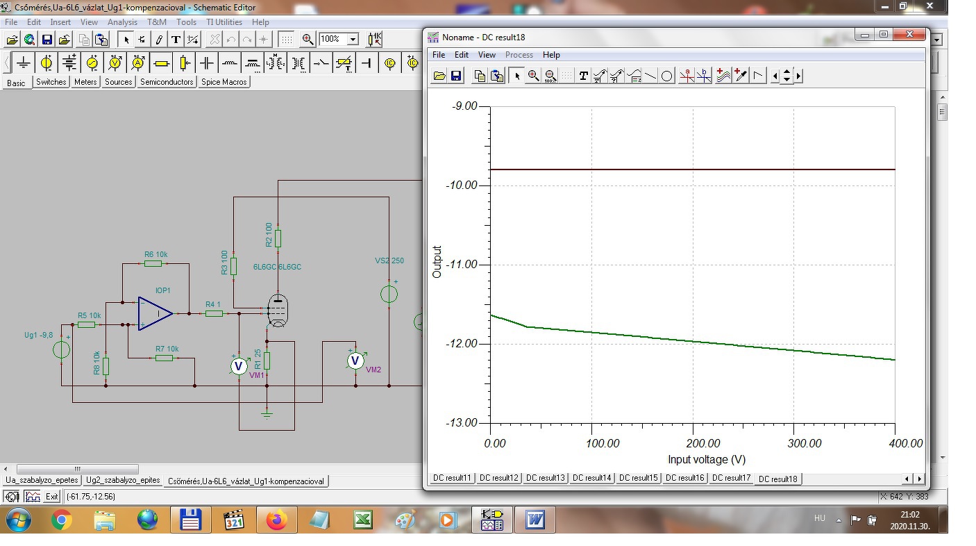 Az Ug1 feszültségszabályzót viszont kicsit át kellett alakítanom, persze ez is ugyanebből az áramköri elrendezésből indult ki, de ugye itt negatív feszültséget kell szabályozni vele, úgy hogy ennél már a 0 volt értéke is pontosan állítható legyen. A szabályozási tartományt így +4V-tól, -40V-ig határoztam meg és ez alapján készítettem el. Természetesen ezt sem lehet a teljes kivezérlési tartományban az elvárt linearitásnak megfelelően beállítani, ezért a szabályzónak csak a lineáris tartományát használom majd a mérés során. Ennek is mellékelem a kapcsolási rajzát és a szimulátor eredményét. A hozzászólás módosítva: Nov 21, 2020