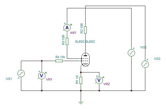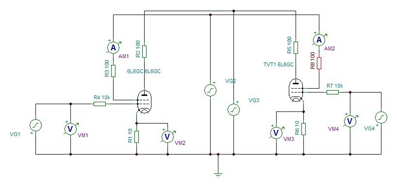 A VG1,VG2,VG3 helyére a valóságban egy-egy feszültségszabályzó kerül, az AM1, VM2 helyére pedig egy-egy ADC konverter, amivel mérem az értékeket. Mindez kétszer mivel ugye az is a cél, hogy két cső, vagy csőfél összehasonlítását(párbaválogatását) könnyen el lehessen végezni.