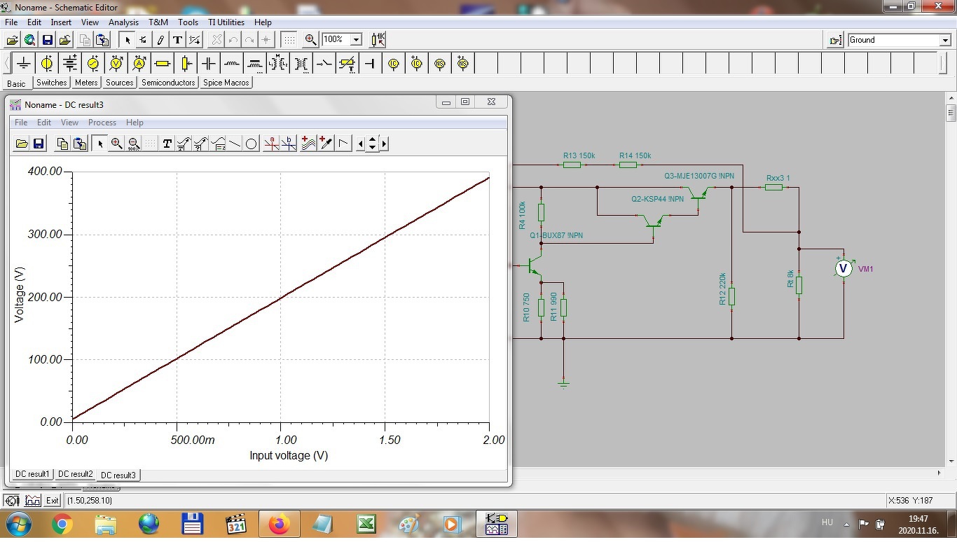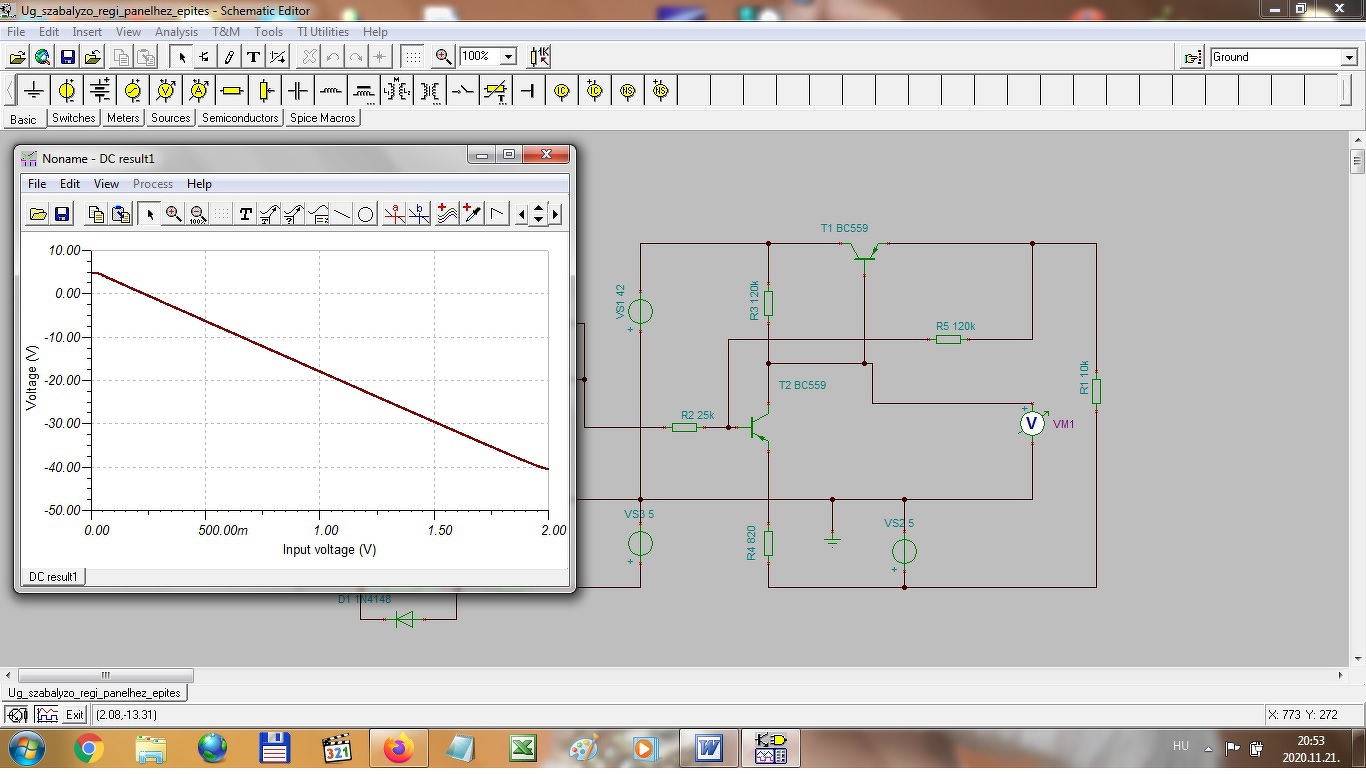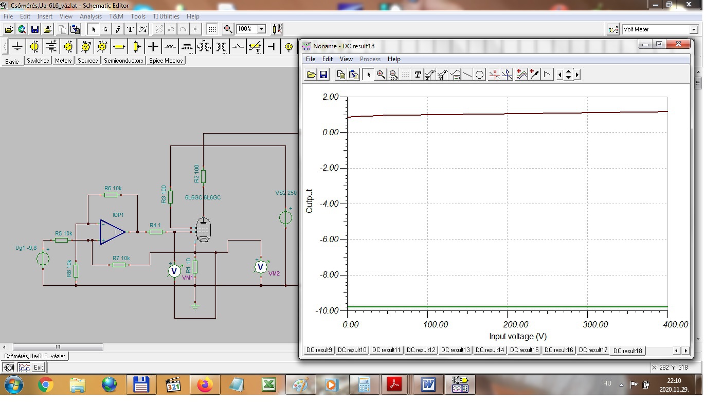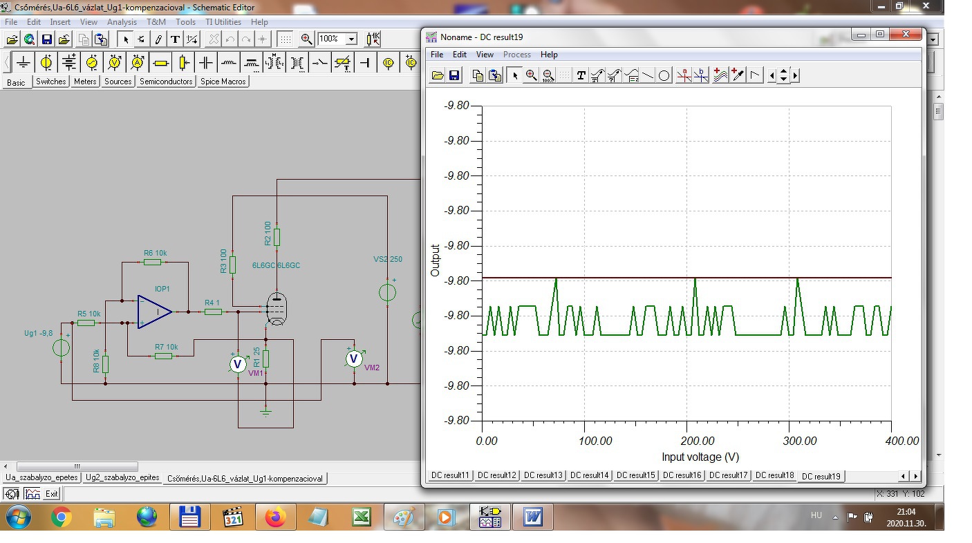 Az Ug1 feszültségszabályzót viszont kicsit át kellett alakítanom, persze ez is ugyanebből az áramköri elrendezésből indult ki, de ugye itt negatív feszültséget kell szabályozni vele, úgy hogy ennél már a 0 volt értéke is pontosan állítható legyen. A szabályozási tartományt így +4V-tól, -40V-ig határoztam meg és ez alapján készítettem el. Természetesen ezt sem lehet a teljes kivezérlési tartományban az elvárt linearitásnak megfelelően beállítani, ezért a szabályzónak csak a lineáris tartományát használom majd a mérés során. Ennek is mellékelem a kapcsolási rajzát és a szimulátor eredményét. A hozzászólás módosítva: Nov 21, 2020