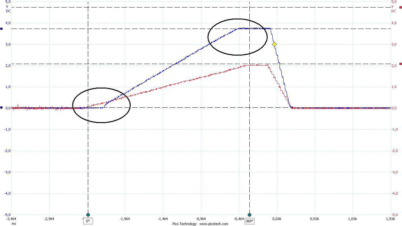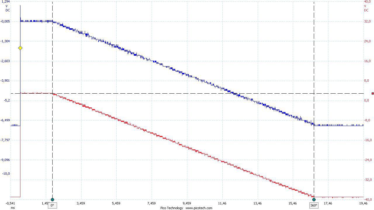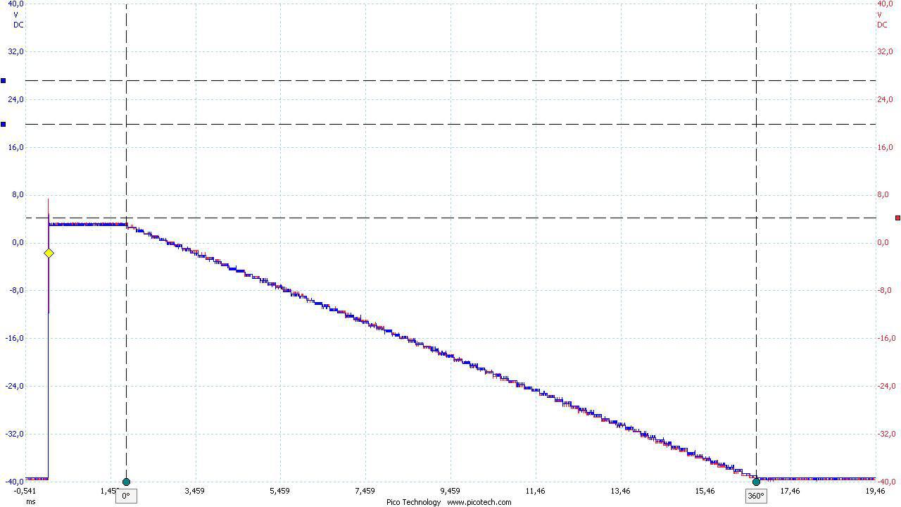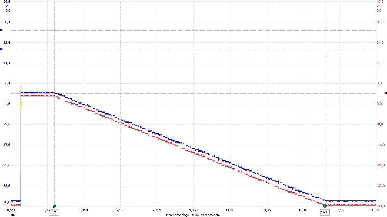 Az Ug1 szabályzók beállításról néhány szót, itt is a szabályzó bemenetére kapcsolódó DAC kimenőfeszültsége a kiinduló érték (szimulátor rajzon a DAC-out) ami jelen esetben is 0 -2047 mV, az a DAC amit használok, csak pozitív feszültséget tud kiadni, ezért ennek feszültségnek a polaritását a szabályzónak meg kell fordítani és kb. +5V – 40V-ra, kell felerősíteni. A beállítás során szintén ofszet és erősítés beállításával lehet a kívánt jelszinteket belőni. Néhány kép ezekről, az első kép még a beállítás előtti oszcilloszkópábra, a kék a DAC jele, a piros pedig a szabályzó kimenete, a bekeretezett részeken látható az eltérés, a második kép mér egy beállított csatorna. A harmadik képen, pedig az A/B csatornák egymáshoz való beállítását mutatják, hogy jobban lehessen látni a két jelet kicsit eltoltam egymástól, a negyedik kép pedig amikor a két Ug1-es csatorna jele, a tényleges feszültségeit mérve látható, szerintem így jó is lett.
