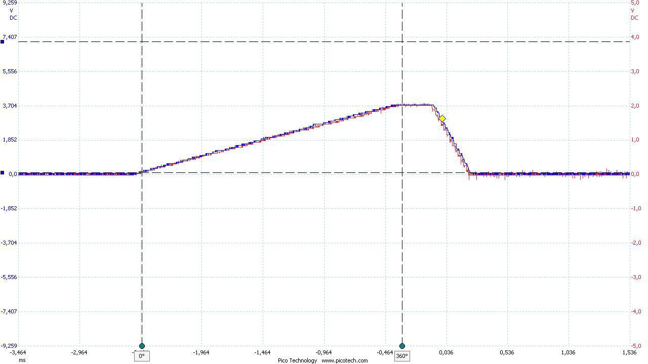 A szimulátoros kép kiegészítésekén (működés közben) készítettem egy képernyőképet is, a piros csatorna a DAC kimeneti jelét mutatja, a kék pedig a szabályzó kimenete 100-as osztón keresztül.
