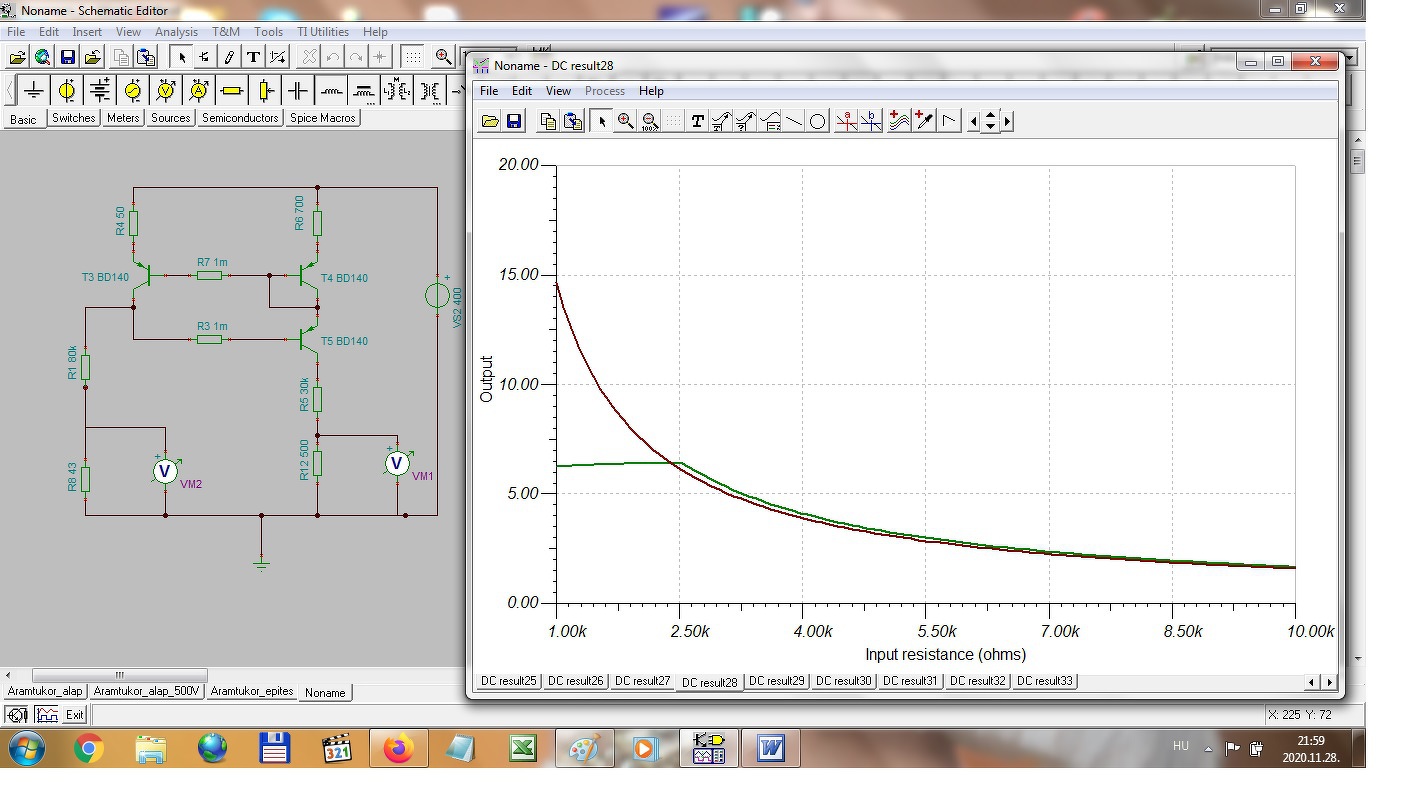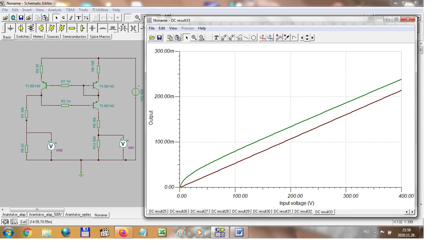 akkor ezt elsőkörben elvetettem mivel az amúgy is nagy anódáram mellé még plusz áramfogyasztót berakni nem tartottan jó ötletnek. Mivel a többi megoldással sem jutottam egyértelmű eredményre, elővettem az áramtükör ötletét újra. A szimulátor mérések elsőkörben egészen jó eredményeket adtak, az alábbiakban egy kép a szimuláció eredményéről.