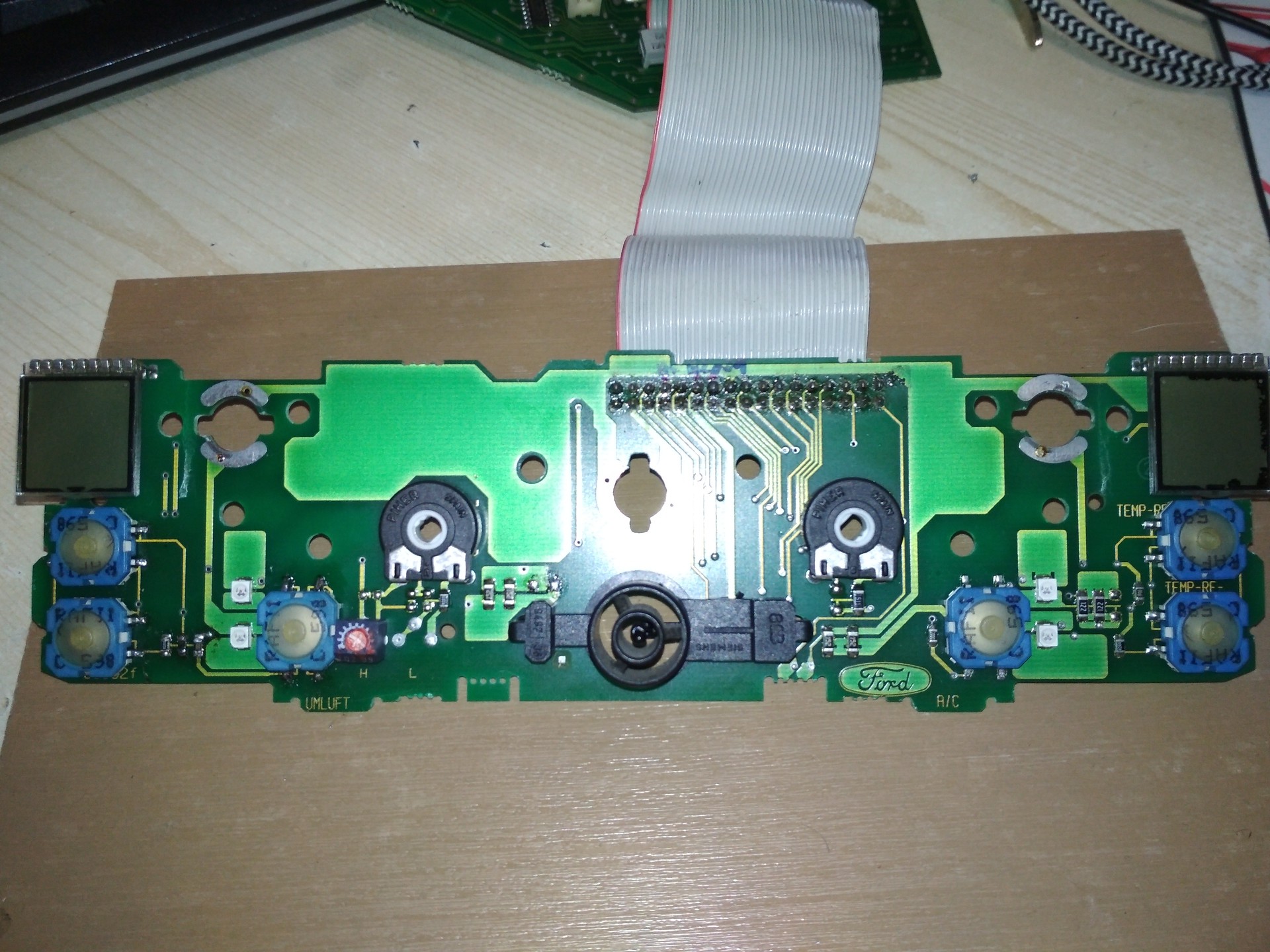 Segítségkéréssel fordulnék hozzátok. A Ford Scorpio-m digi klímavezérlőjének a gombjai felcserélődtek vagy nem működnek. A bal oldalon van 3 gomb, hő plusz, minusz és a belső keringetés. Jobb oldalon plusz, minusz és az AC gomb. Jelenleg a hőmérséklet plusz gomb lefelé állítja a hőmérsékletet a harmadik gomb, tehát az AC és belső keringetés gombjai állítják felfelé a hőmérsékletet a két oldalon. A hő minusz gombok nem csinálnak semmit, tehát az AC és belső keringetés funkció egyáltalán nem kapcsolható. A bal és jobb oldali 3-3 gombok jele 1 vezetéken közlekedik, a 3 gombnak 3 különböző ellenállása van(820, 200 és 390 ohm), amivel a vezetéken lévő feszültséget változtatják gombnyomásra. Az első javítási kísérletem az volt, hogy kiforrasztottam a bal oldali belső keringetés gomb ellenállását, egy 5K trimmer potit kötöttem be a helyére és a potit tekergetve és a gombot nyomkodva próbáltam belőni a megfelelő ellenállást, amivel a gomb a rendeltetése szerint működik. Ez sikerült is félig, a hőmérséklet fel és le szabályzását tudtam is működtetni erről az egy gombról, de a belső keringetés nem. Két nyákja van a klímavezérlőnek, az egyiken van egy régi 8 bites siemens mikrocontroller, a másikon pedig a gombok, potik, kijelzők vannak. a gombos panelen kimértem az ellenállásokat, gombnyomásra ugyanazt az értéket adják, mint ami a gombokhoz tartozó smd ellenállásokon jelölve van. Ellenőriztem a szalagkábelt is ami összeköti a két panelt, semmi baja, a másik panelen mérve is ugyanezeket az értékeket hozza. Méregettem feszültségeket is, a gombok jelét hordozó vezeték és a negatív táp között 4,55V-ot mértem, gombnyomásra nagyából 3,7V 3,4V 2,8V körüli értékek jöttek. (ennyire emlékszem, nem pontos adatok) Hiába nézegetem, nem igazán van további ötletem, hogy mit próbálhatnék ki. Van ötletetek, hogy pontosan milyen elven működhet, illetve hol lenne érdemes a problémát tovább keresni?