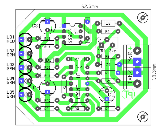 Hello! Ebben az esetben a GAS kapcsolást kellene megépíteni, és az R1 ellenállást 1kohm-ra választani. A villogást legegyszerűbben úgy lehetne megoldani, ha a D1 egy villogó Led, és amikor a D2 is világítani kezd, a D1-et egy tranyóval rövidrezárjuk. Tehát kettes szint után a piros már sötét lesz. Ha így megfelel.. Tele állapotban az összes Led világít.