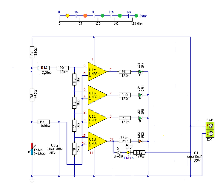 Ebből adódik hogy 5 ledet szeretnék müködtetni vele. D1 villogó sárga (0 ohm)D2 piros (1/4 ami 55 ohm) D3-4-5 zöld(1/2-3/4-, 4/4-190ohm azaz tele tank)