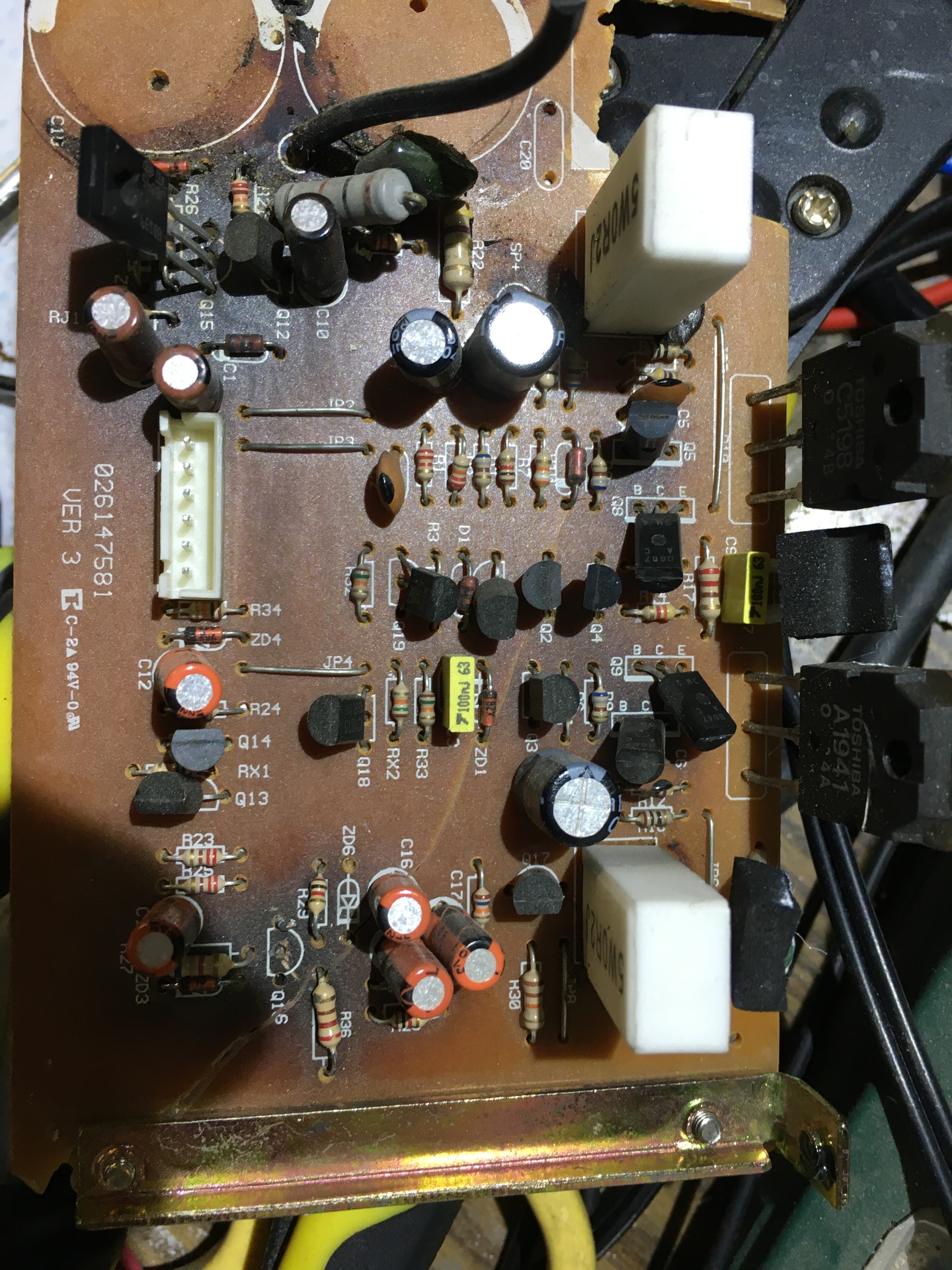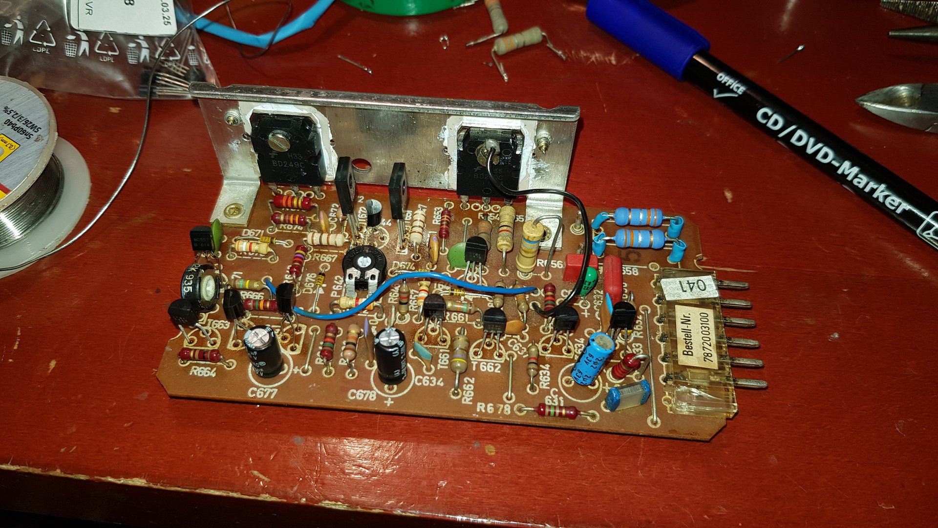 Segítséget szeretnék kérni, hozzám került egy teufel cem 500 sw típusú 5.1-es mélyláda. Az 5.0-ás részét sikerült már helyre rakni, de a mély végfokjával nem boldogulok. A kimeneti egyenfeszültség 65mV, a bemenetén van jel ellenőriztem, mégis a kimenetén semmi sincs, még csak zaj se, mintha némítva lenne. A panelen az összes félvezetőt végig mértem némelyiket kiforrasztottam és úgyis de multiméterrel mérve mind jók. (A másik panel egy ugyanilyen méyládából van, amit régen bontottam el, csak azért fotóztam mert a kérdéses panel is ugyanolyan.)