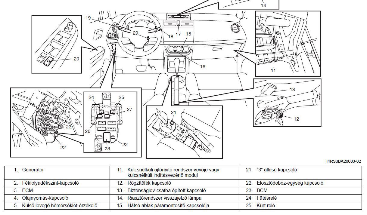 BCM általános leírása H4RS0BA201001 A karosszéria elektromos vezérlőmodul (BCM) az elosztódoboz-egységben található. Ne kíséreljen meg a BCM leszerelését az elosztódoboz egységről, mert az érintkezési hibát okozhat. A BCM tartalmazza a következő rendszerek reléit és vezérlőszerkezeteit, és vezérli is azokat. • Központi ajtózár • Kulcsnélküli ajtónyitó rendszer • Kulcsnélküli indítórendszer ajtózárási funkciója • Hátsó ablaktörlő • Műszeregység • Belső világítás • Figyelmeztető csipogó • Hátsó ablak páramentesítő és visszapillantó tükör fűtés • Csomagtér-ajtónyitó • Riasztórendszer visszajelző lámpa Továbbá, a BCM egy olyan funkcióval is rendelkezik, amelyik kikapcsolja a belső világítást és a 15 másodpercnél hosszabb ideig nyitva felejtett ajtókra figyelmeztető lámpát a műszeregységben az akkumulátor felesleges fogyasztásának csökkentése érdekében. Ezen felül ellenőrizze az ECM által vezérelt működtető működését, amely a SUZUKI vizsgálókészülék teszt funkciójának kimenetét egyidejűleg felhasználva működteti a működtetőt. A szervizkönyv alapján. Üdv: Gábor A hozzászólás módosítva: Márc 4, 2021