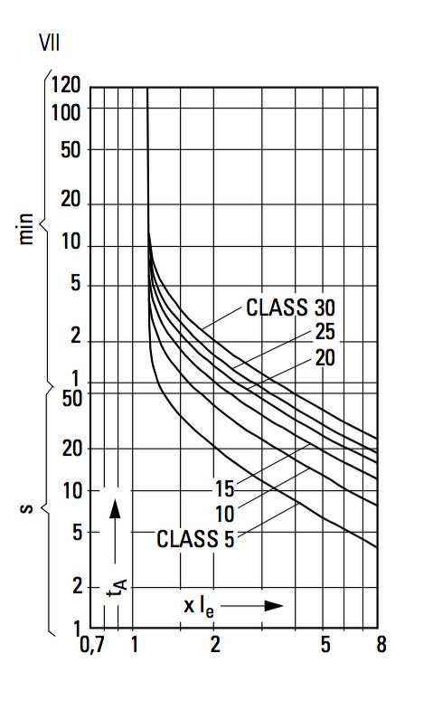 Mellékletben a használati utasítás. Neked a VII nevű karakterisztika érdekes. Pl. CLASS 5 beállítás: ha a motor árama kétszer annyi, mint a beállított áram, akkor kb. 20 másodperc lekapcsolja a hálózatról a motort.