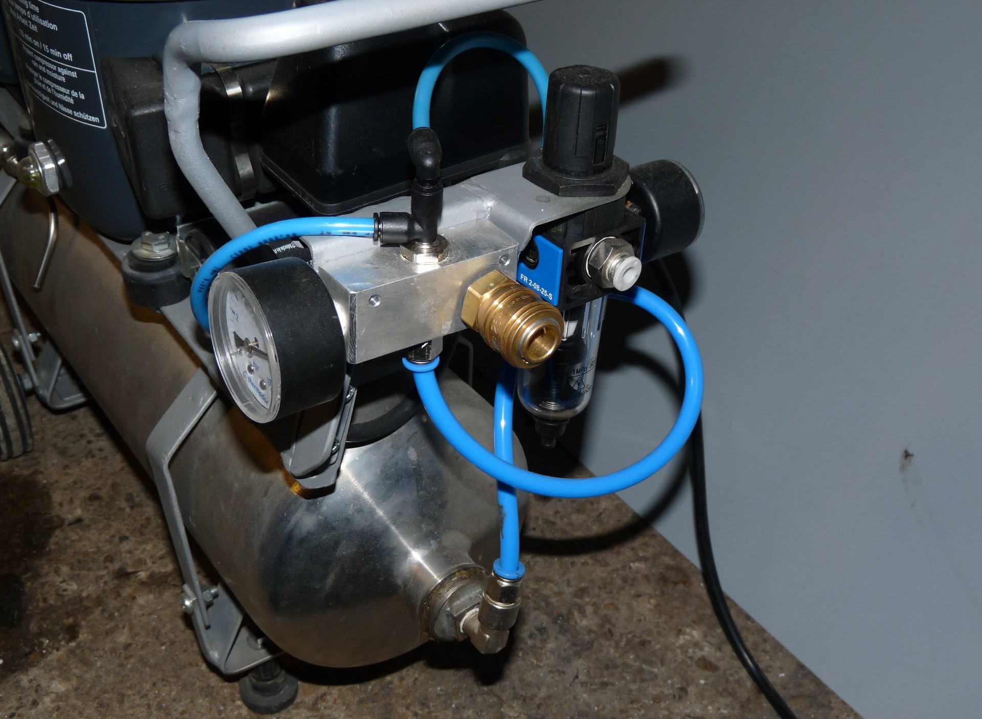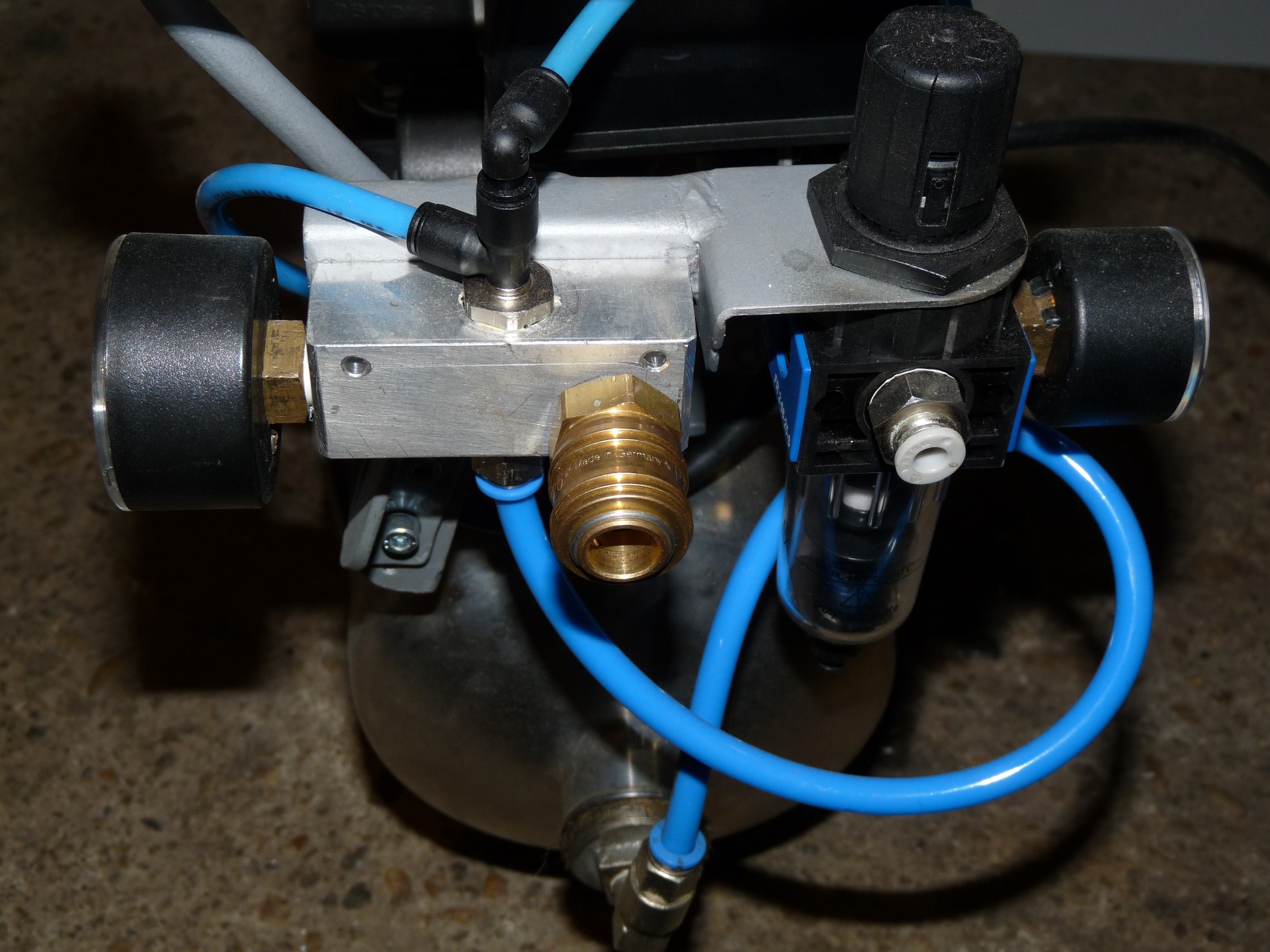 Elkészült nekem is egy kisebb munkákra alkalmas kompresszor. A kéthengeres egység maximális? nyomása 15 bar. Eddig volt kipróbálva, ennyi persze nem kell. A látszattal ellentétben, nem hűtőgép kompresszor. A végleges változat 8 bar nyomáson lett limitálva. Az alsó tartály egy Festo gyári tartály, a kompresszor melletti, a vízlecsapatás miatt került a rendszerbe, ez egy Saratov hűtőgép kibelezett, a megfelelő csonkokkal ellátott, utána összehegesztett, nyomáspróbázott kompresszor burkolata. Ennek az alján lehet leengedni a kondenzvizet. Az alsón is van, de odáig még nem jutott számottevő mennyiség. Így összesen kb. 15 literes a légtartály, amit 6 bar nyomásra 1,5 perc, 8 bar nyomásra 2,3 perc alatt tölt fel. Két kimenete van, az egyik gyorscsatlakozós direkt kimenet, és egy szabályozható, 8 mm-es pneumatika csőhöz. A kimeneti elosztótömb, csatlakozók is saját készítés.