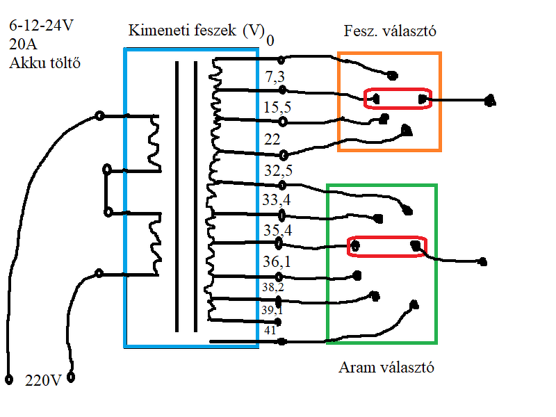 Valaki esetleg tudja, hogy miként van megoldva ennél a töltőnél a fokozatok kapcsolása? A szekunder tekercsen van 11 kivezetés. Néhány vezeték megy a feszültség választóhoz, a többi pedig az áramválasztó kapcsolóhoz. Érdekes, hogy a fentebb említett töltési feszültségek ellenére, a legnagyobb feszültség 41V körül alakul a kivezetések között. Nem egészen értem, hogy milyen kapcsolástechnika állhat a dolog mögött. A méréseim alapján az összes szekunder kivezetés kapcsolatban áll egymással.