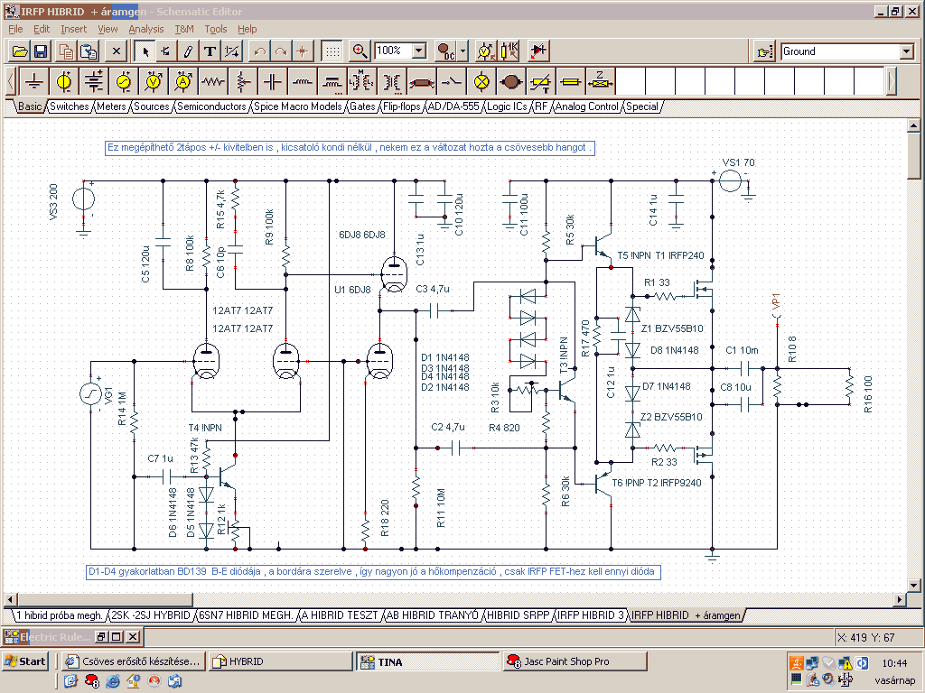 Itt az egyszerűbb hibrid rajza ,.bár a csöves része nem annnyira..... Ha megcsinálnád , akkor további info is mehet , a beállításokhoz és egyebek ... Galériában rátalálsz a megépített változatára , fekete dobozban , félvezetős része 2db . trafóról , de minden táp dupla L/R külön . Csöves meghajtása lehetne minimalistább is , de arra törekedtem ,hogy erősítés során egyetlen fokozaton sem forduljon fázis , ez így teljesül , kimenete is jól terhelhető aktív katódkövető miatt .. Megépíthető kettős +/- táppal is , kipróbáltam , nekem ez a változat , az 1 tápos hozta jobban a csöves hangzást . Alkatrészek beszerezhetők és nem drágák , jobb FET-tel 2SK1058 / 2SJ162 is megépíthető és a hőkompenzáció is egyszerűbb lenne , de nagyon drága fetek és sok a hamisítvány közöttük ... Visszcsatolás nélkül 1% alatti torzítással 40W jön ki , kapacitív terhelést is jól tűri . Ha lenne még kérdés , akkor javasolnám a többit magánban , mert it nagyon sok ez a félvezető mennyiség